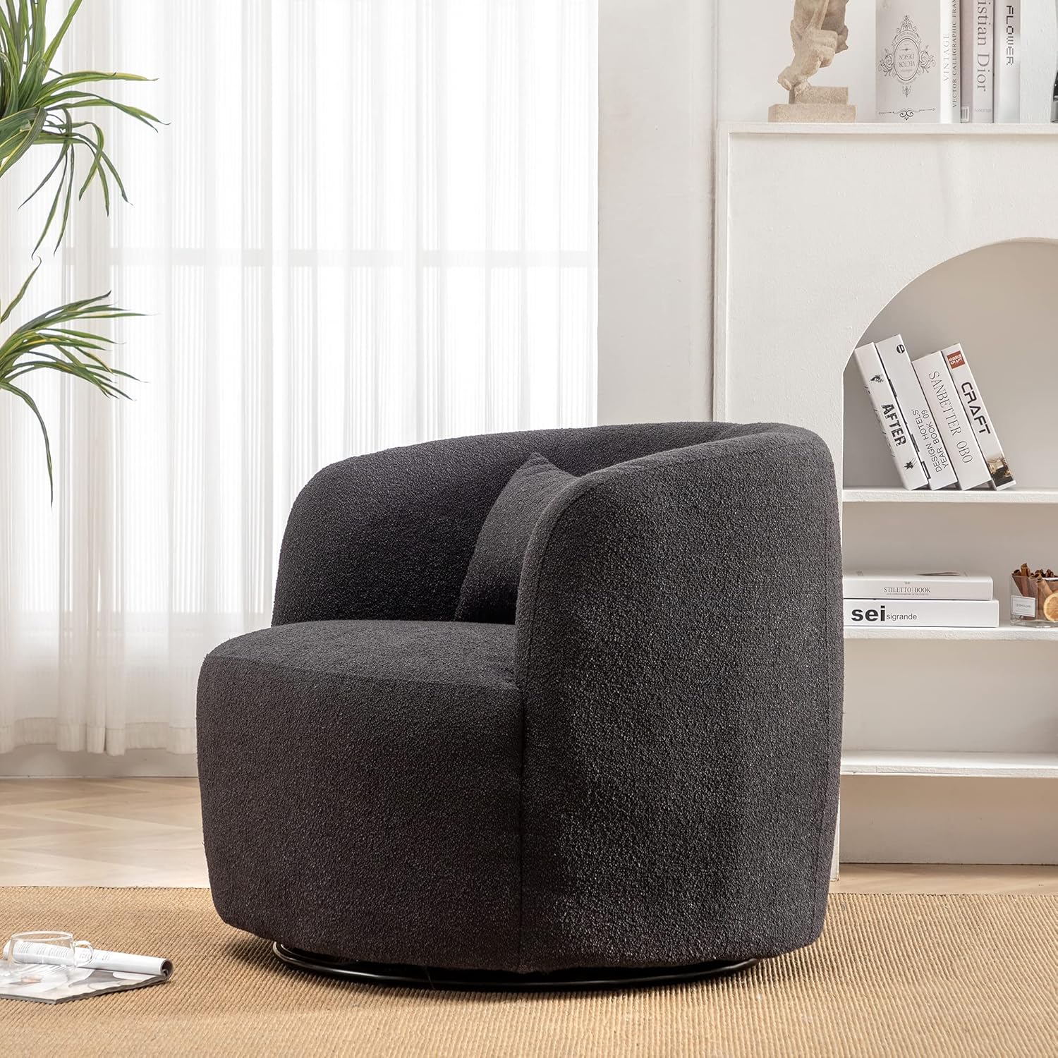 KINWELL 34" Wide Boucle Swivel Barrel Chair, No Assembly Round Upholstered Armchair Accent Chair Single Sofa Chair with Toss Pillow for Living Room and Bedroom, Dark Grey