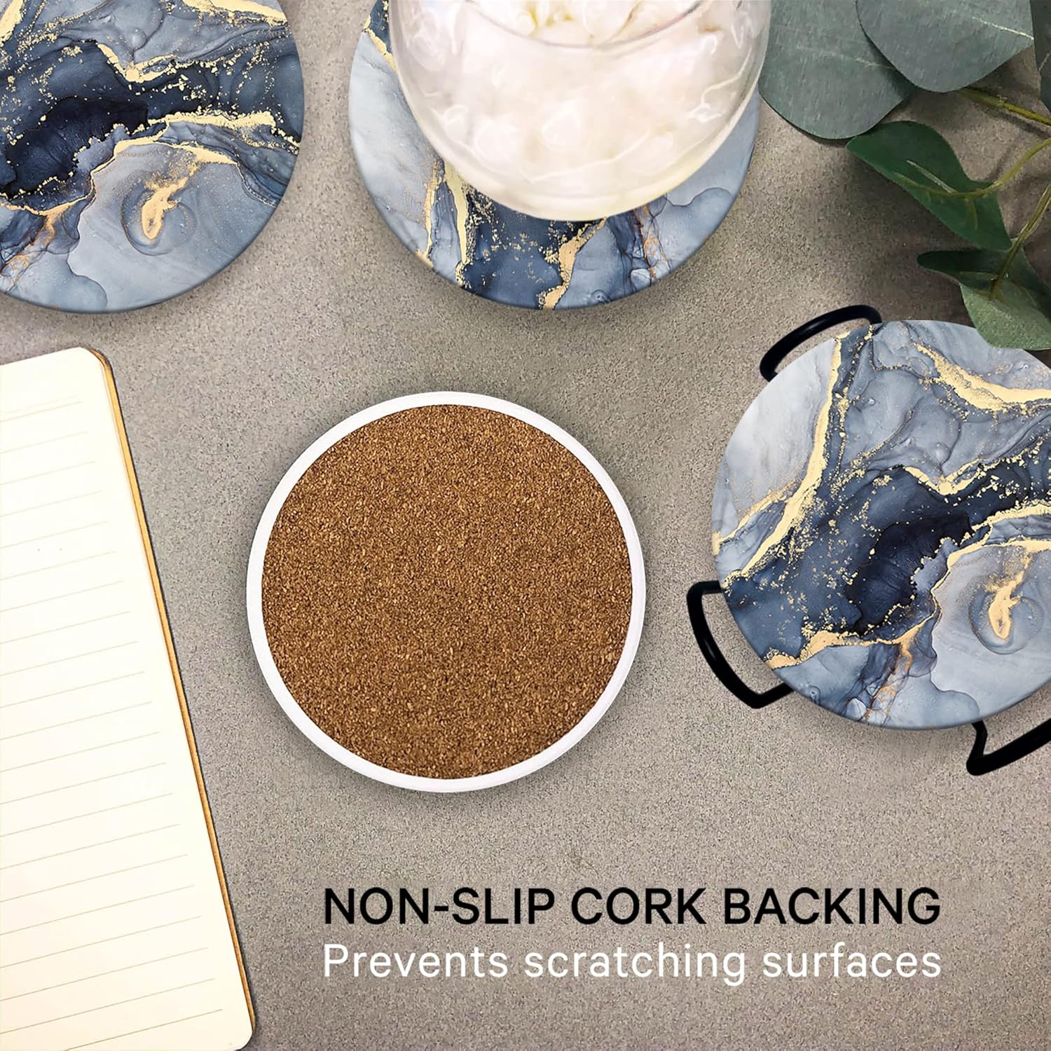 Emerson Coasters for Drinks Absorbent – Saucers Coffee Table Set of 6 with Holder, Wooden Tabletop Protection Marble Style 100% Ceramic - Non-Slip & Cork Bottom - Heavy Duty Drink Coasters (Riptide)
