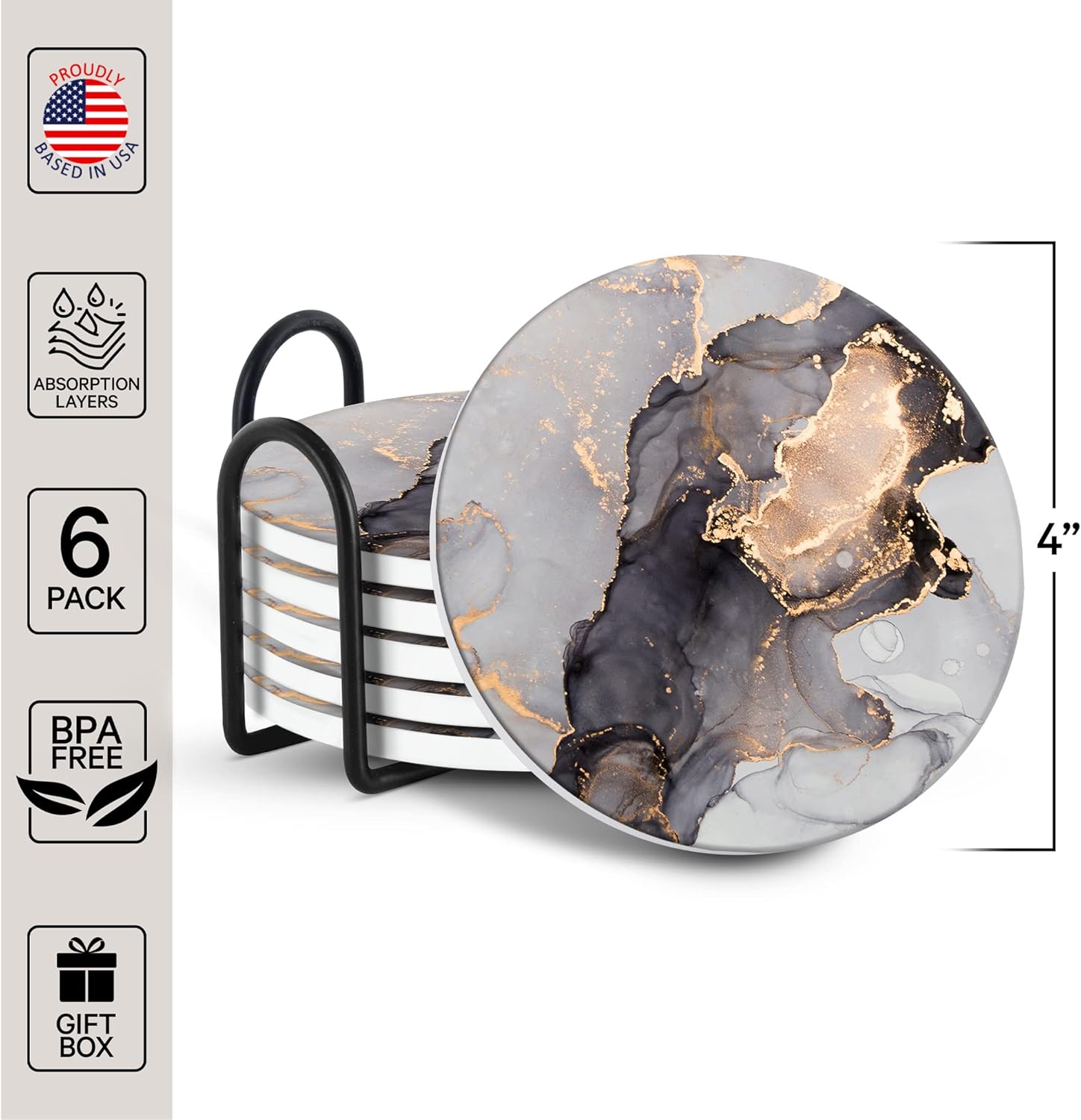 Emerson Coasters for Drinks Absorbent – Saucers Coffee Table Set of 6 with Holder, 100% Ceramic Wooden Tabletop Protection Marble Style, Non-Slip & Cork Bottom - Heavy Duty Drink Coasters (Crown)