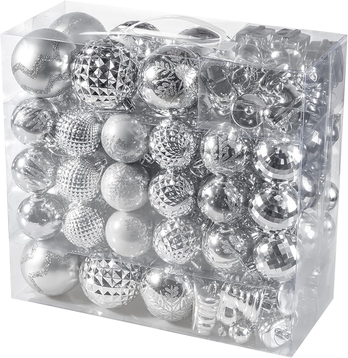 - 【Christmas Ball Ornaments】 This silver assorted Christmas ornament set contains 116PCS of Christmas balls in 18 styles, includes various shapes, sizes, such as 1.57” / 2.36” / 3.14” Christmas ball, stocking , bell, and gift. It's your call to complete your Christmas decoration with these beautiful balls ornaments set, and make the Christmas season more memorable and unique