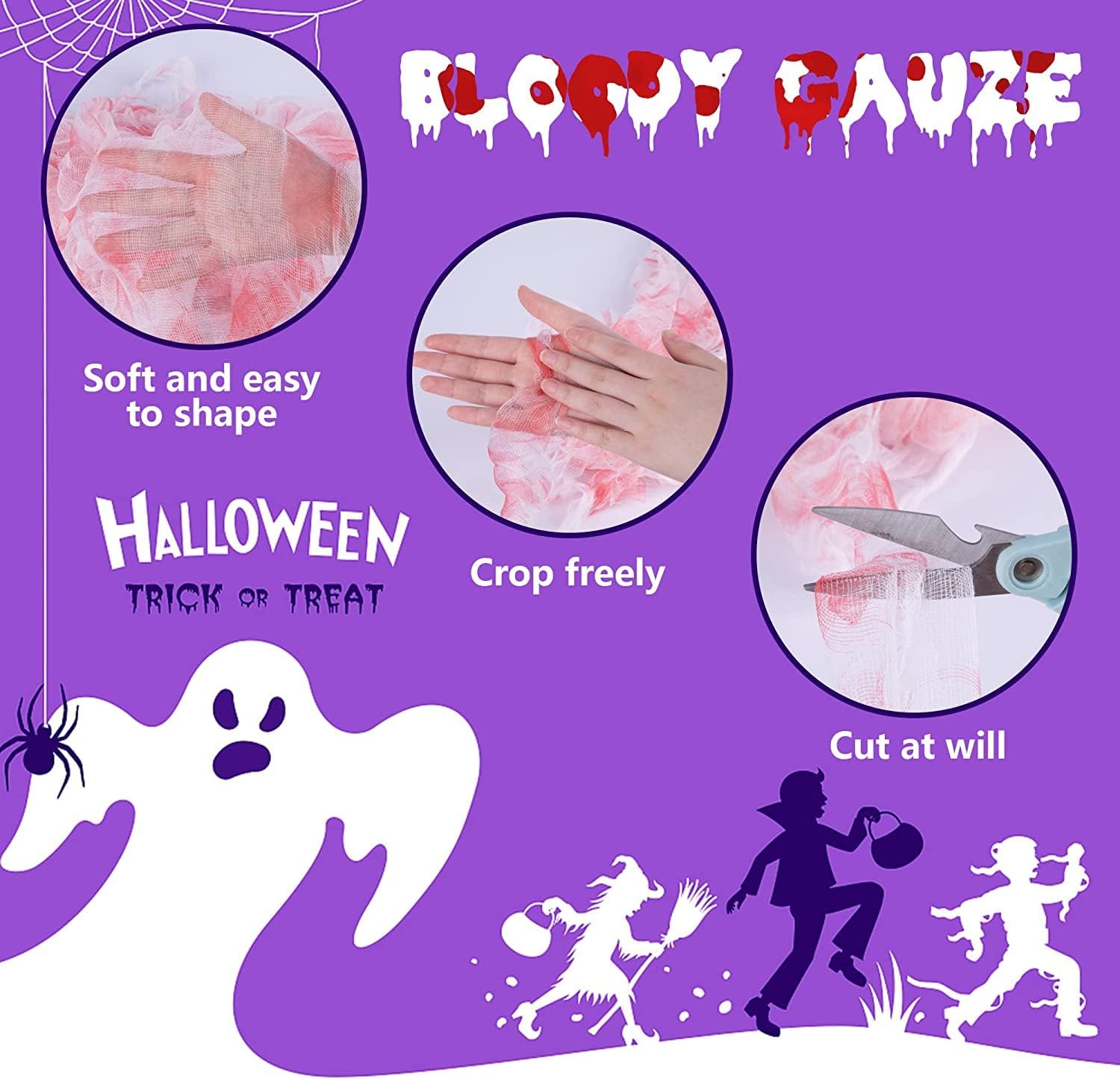- Application scenarios: You can use the Bloody creepy gauze to decorate doors, window, bathrooms, porches and walls when holding Halloween parties, midnight thriller challenge activities, etc. It provide a better atmosphere for scary scenes .