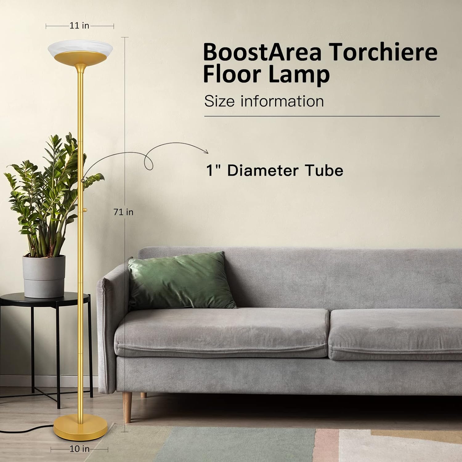BoostArea Torchiere Floor Lamp, 24W Super Bright LED Standing Lamp, 3000K Stepless Dimmable Pole Lamp with Rotary Switch, 70 Inch Tall Metal Modern Floor Lamps for Living Room/Bedroom/Office/Den, Gold