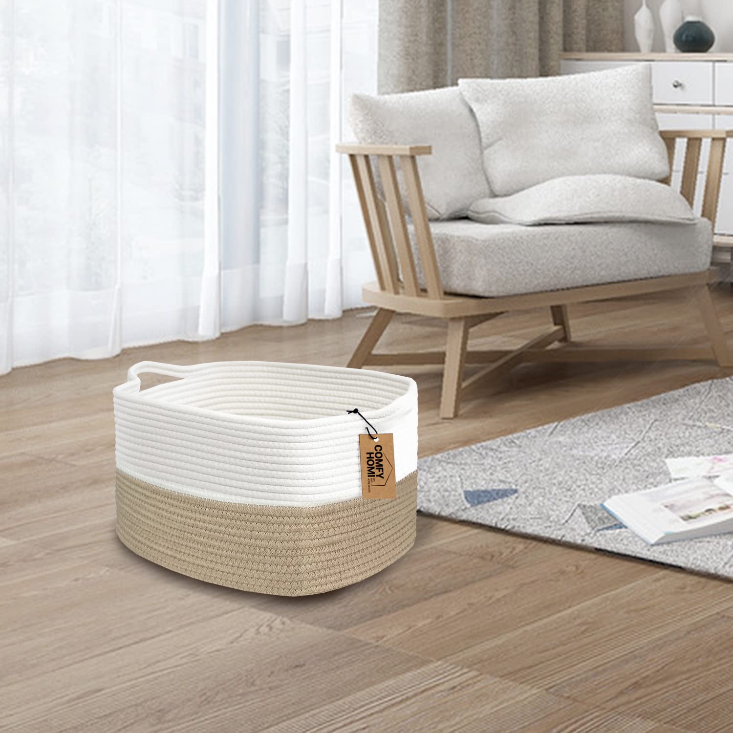 COMFY-HOMI Cotton Rope Woven Basket with Handles for Shelves,Toys,Book, Cloth Storage Baskets Bin for Organizing-13.5"x11"x9.5" Toy Decorative Organizer for Living Room, Bathroom-Light Brown