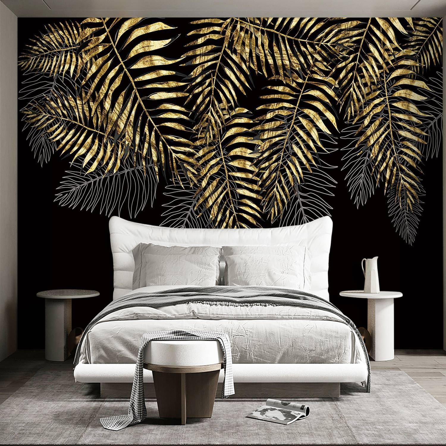 Black and Gold Leaf Mural Bedroom Tropical Botanical Wallpaper Room Plant Decor Living Room tv Background Large Wall Mural - 91"x65" (Not Peel and Stick)