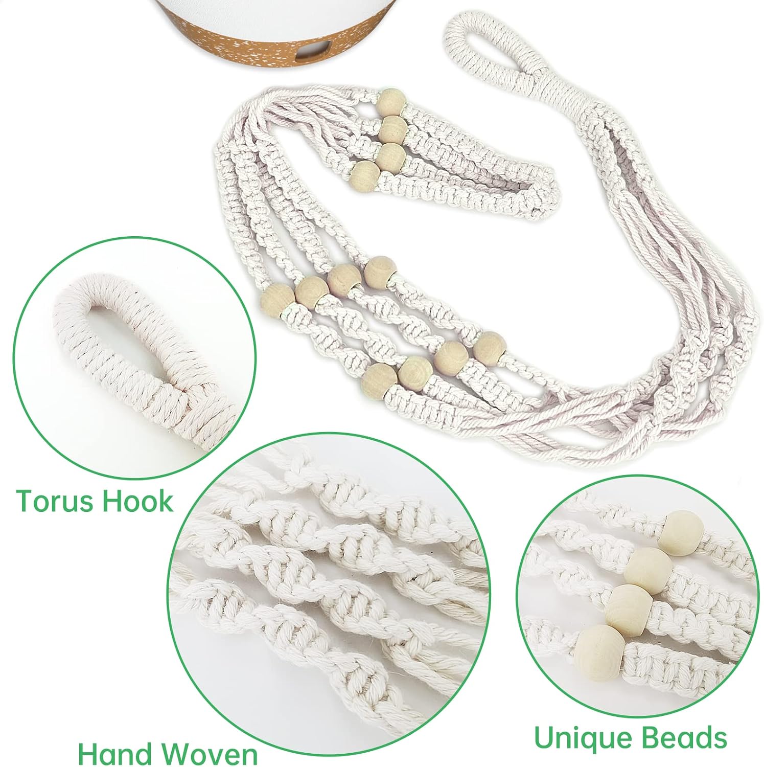 - Handmade Macrame Plant Hanger: The Hanging Planter Basket is made of 100% Pure cotton cord, high resistance to tearing and high safety. The unique beads makes the plant hanger more decorative and look good when hung.