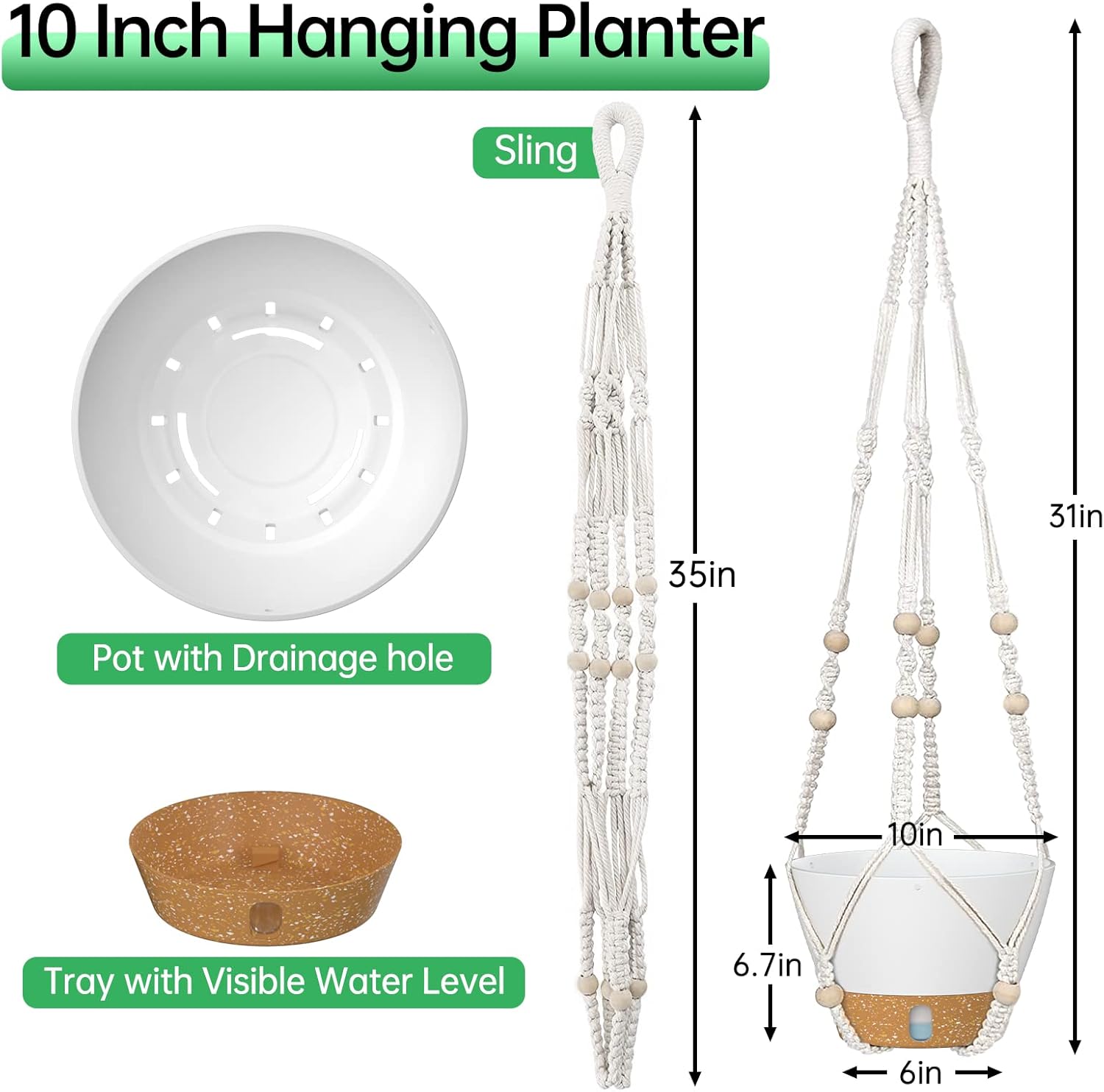 - Package Includes: 2 Pack Hainging Planters + 2 Pack Macrame Plant Hangers, pot size: 10'' * 6.7''(Diameter * Height), hanger length: 35"; The matte color is perfect for any home decor style. Hanging vertically for easy space-saving, it is perfect for your patio, garden, porch, balcony, home, room, or near a window to add more cozy green accents.