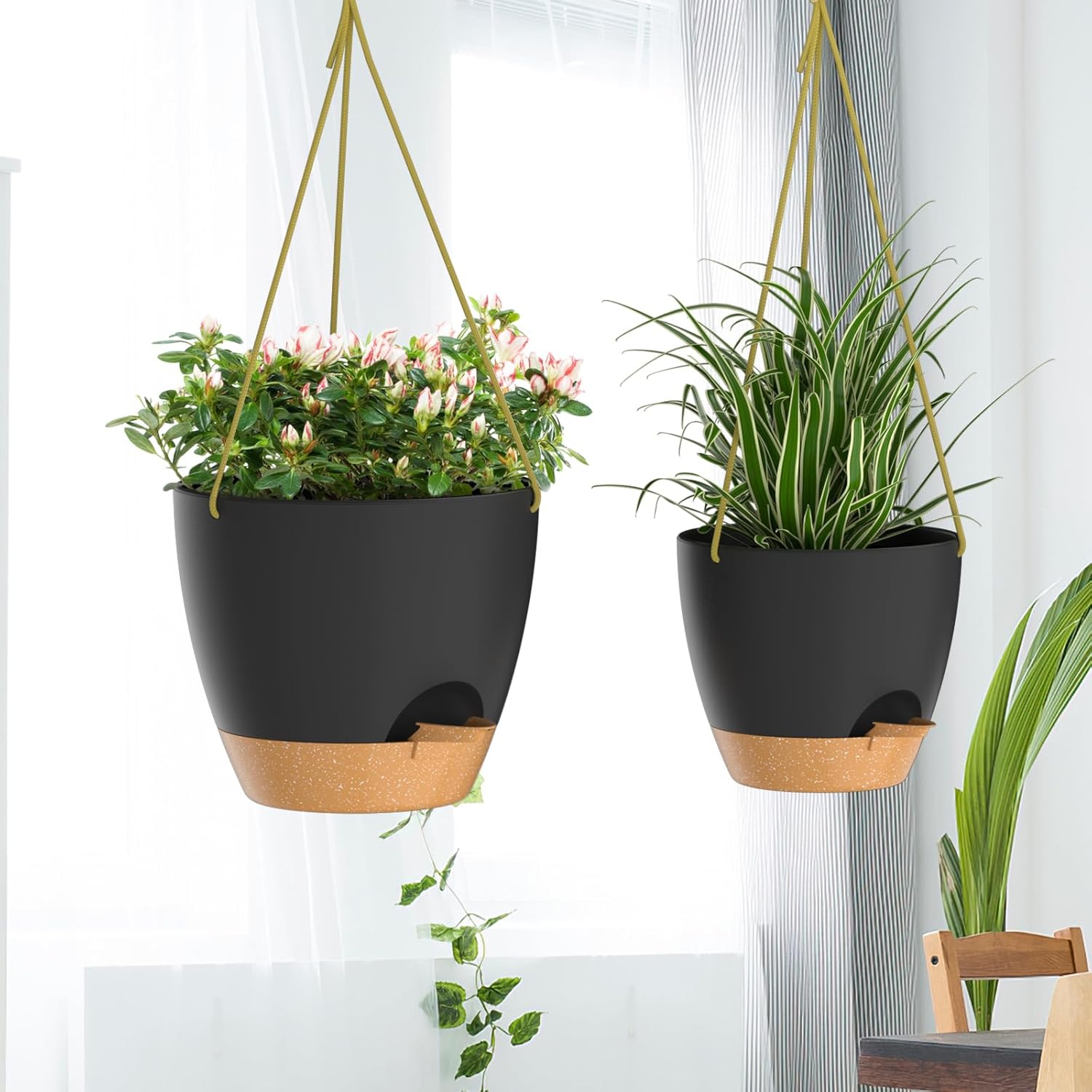- Self Watering Hanging Planters: The hanging planters have an absorbent cotton rope and a removable reservoir. It ensures that your plants are not soaked in water and prevents root rot. The large capacity saucer provides enough water for your plants and the plant pots will keep them growing normally for 7-10 days, so you don't have to worry about your plants drying out even if you are travelling far away;