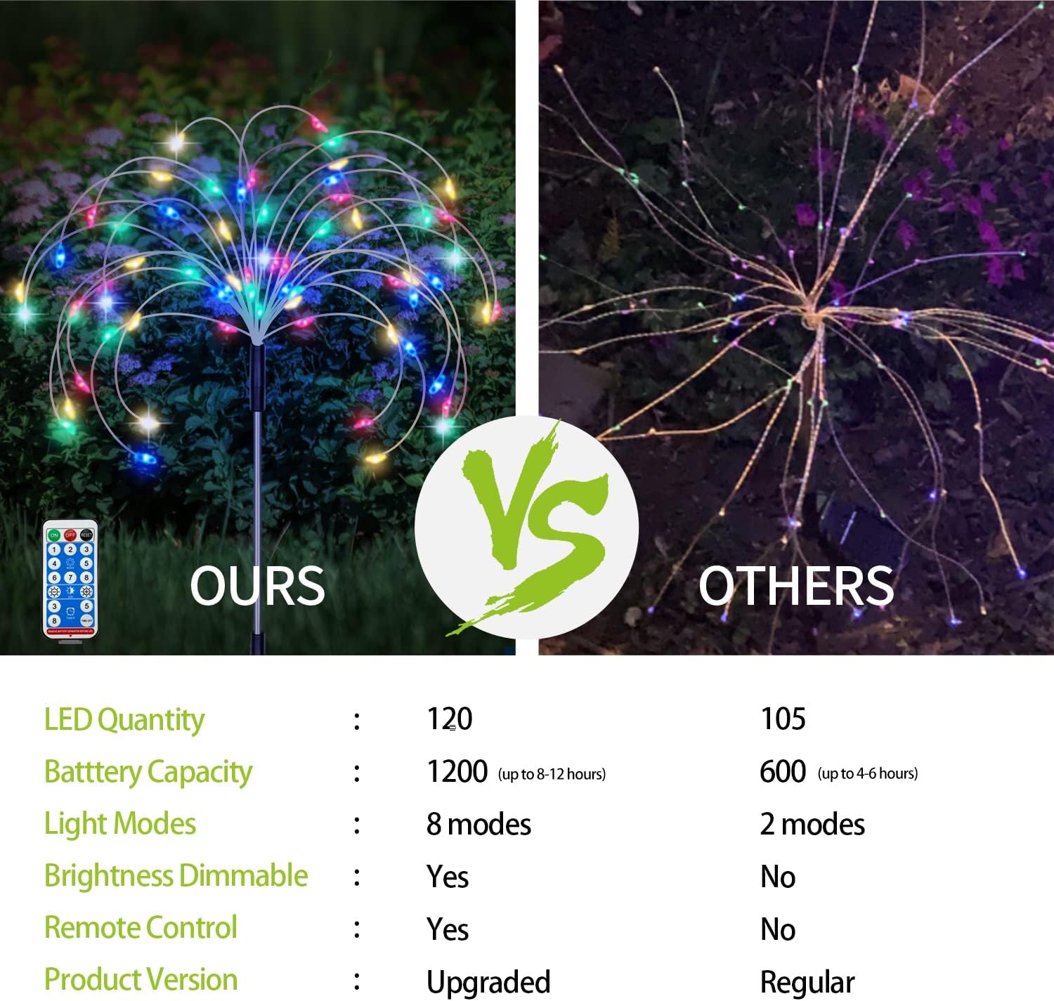 - ♥3 Brightness & 8 Lighting Modes: Just need to charge for 4-6 hours , provide 12-16 hours of continuous lighting, solar garden light must be installed in a south-facing sunny place. The solar garden firework lights are equipped with a remote control, you can use the remote control to adjust 3 levels of brightness and 8 flashing modes. The outdoor decorative light has a memory function. and will return to the last set mode the next time it is turned on.