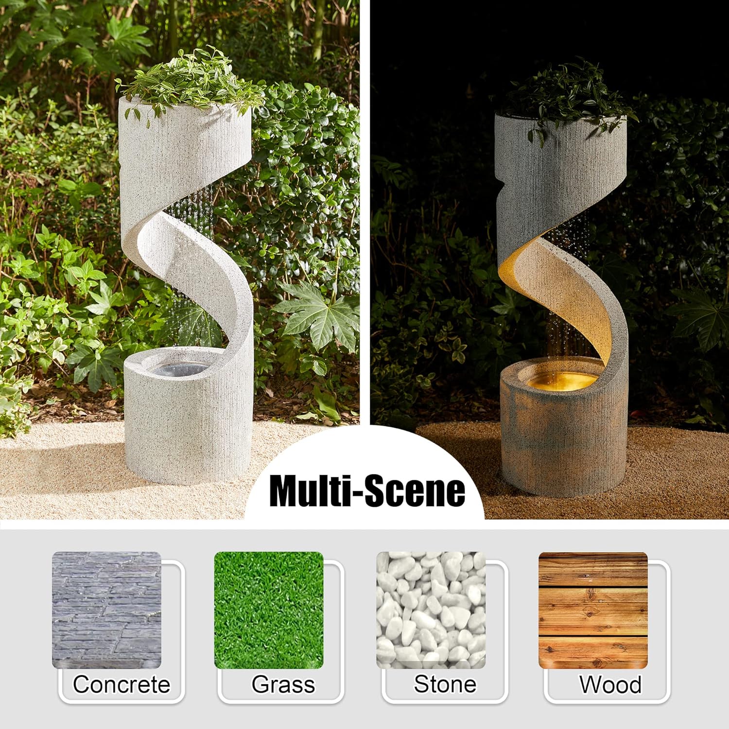 - Unique Design: Rustic stone water fountain features modern and minimalist curving shaped combined with streamline falling water, with imitation concrete looking, offers vintage weathered accent and aesthetics. With an antique look, the water fountain brings a touch of rustic charm, the soft sound of cascading water is sure to make you relaxed and makes a rest for you in the garden. The screen prevent the fountain from splashing and the pump can be adjusted to prevent loud water sound