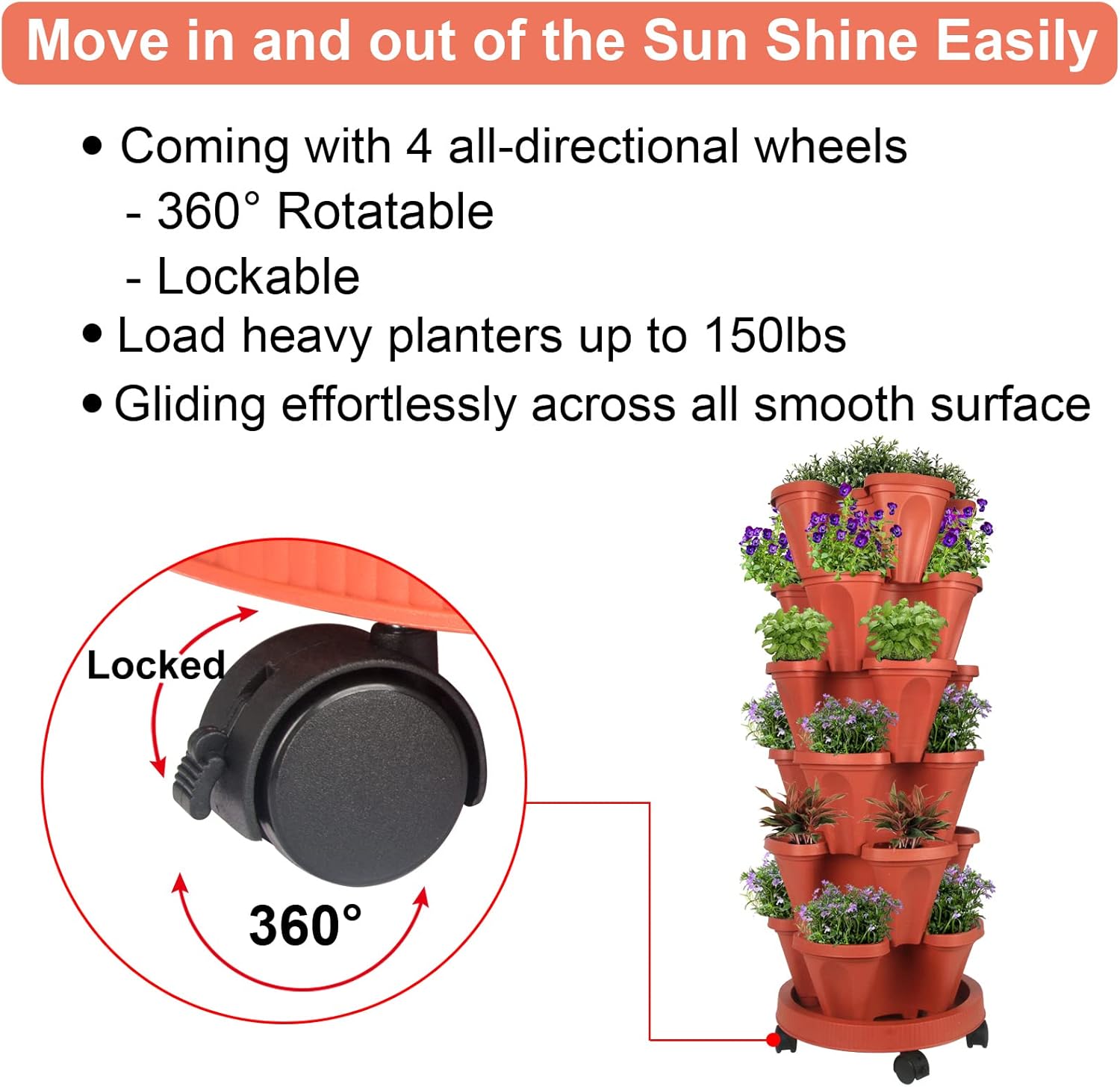Vertical Planter 6 Tier Stackable Planters Garden Planters Strawberry Herb Flower and Vegetable Planter Indoor Outdoor Gardening Pots with Removable Wheels and Tools