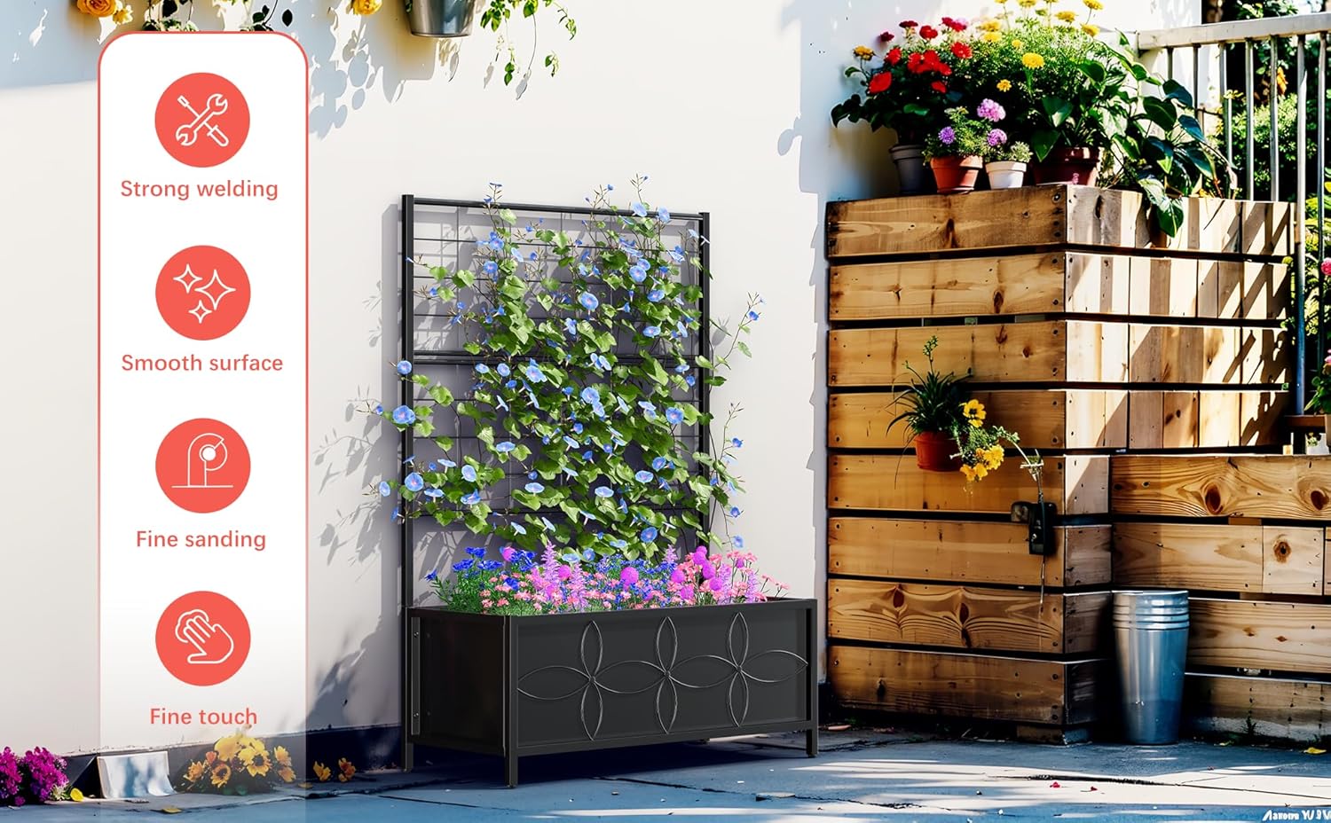 - This planter with trellis is made of a strong carbon steel base. It's sturdy and solid for long time and durable usage. Moisture Resistant,Maintain beauty and performance.