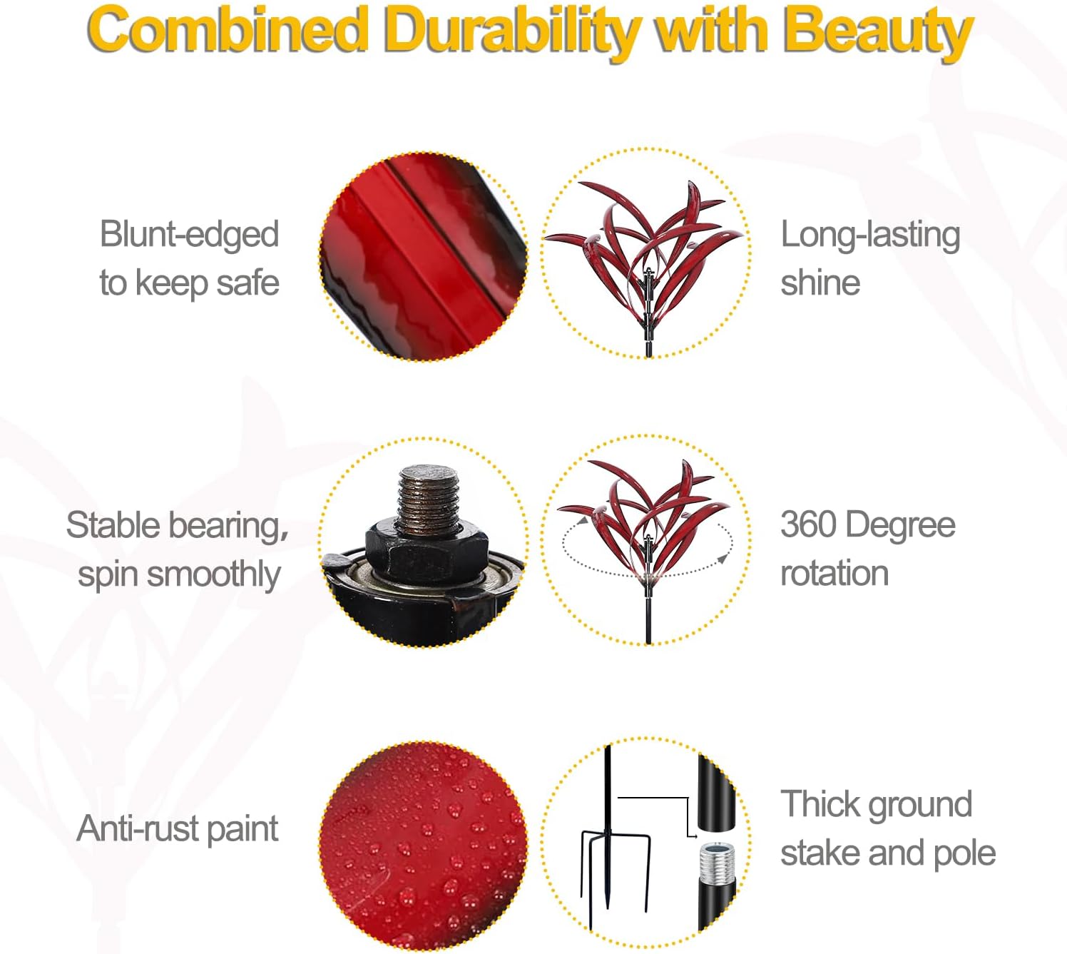 - 【Combined Durability with Beauty】Dual ball bearing movement, 360 Degree rotation, no noise interference.This beautiful garden wind spinner is crafted from sturdy material to last for seasons to come.