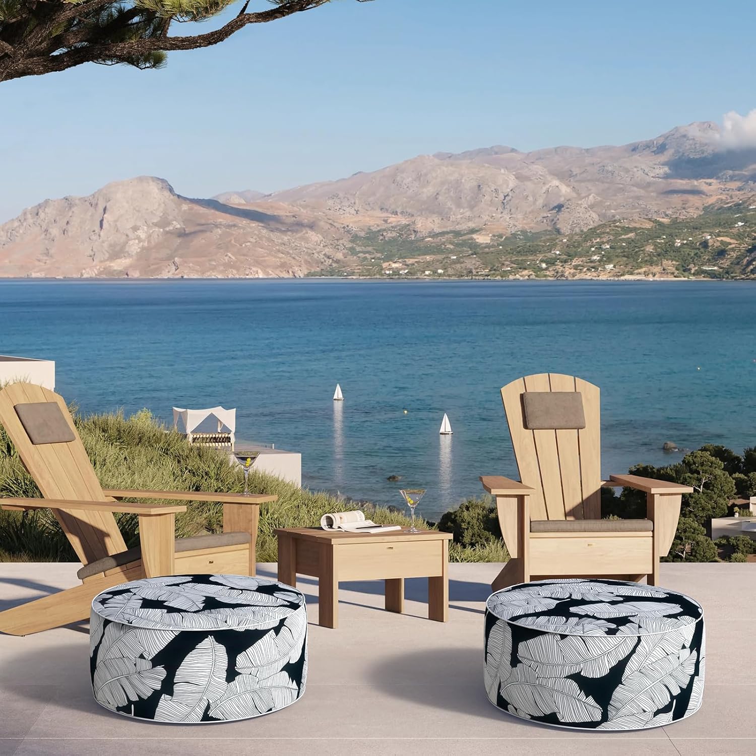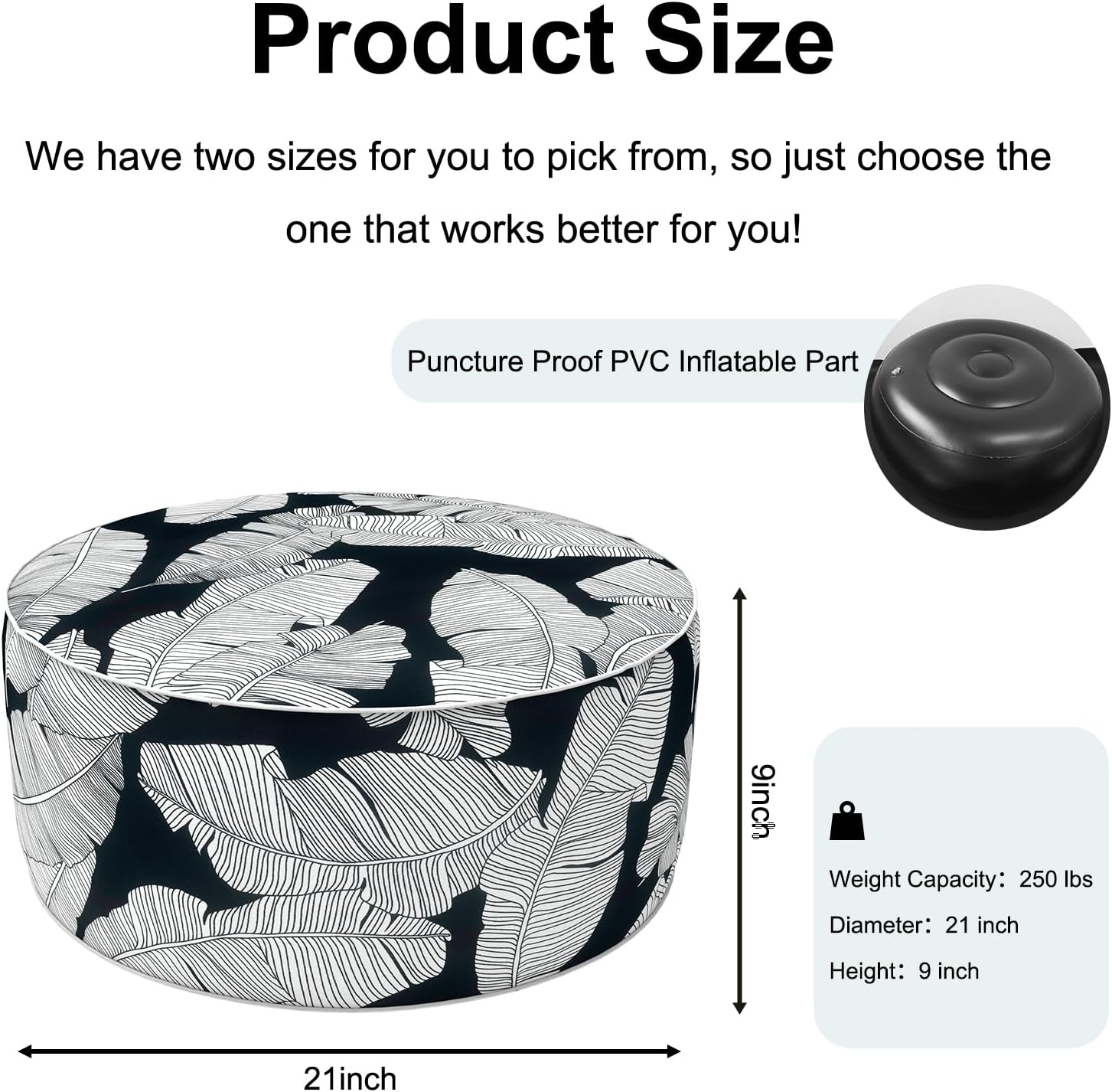 Inflatable Ottoman Stool D21 xH9 for Outdoor/Indoor Use, Water Repellent Patio Foot Rest Stool with Portable Handle,Round Pouf Ottoman Suitable for Garden,Deck and Camping - Black Leaves