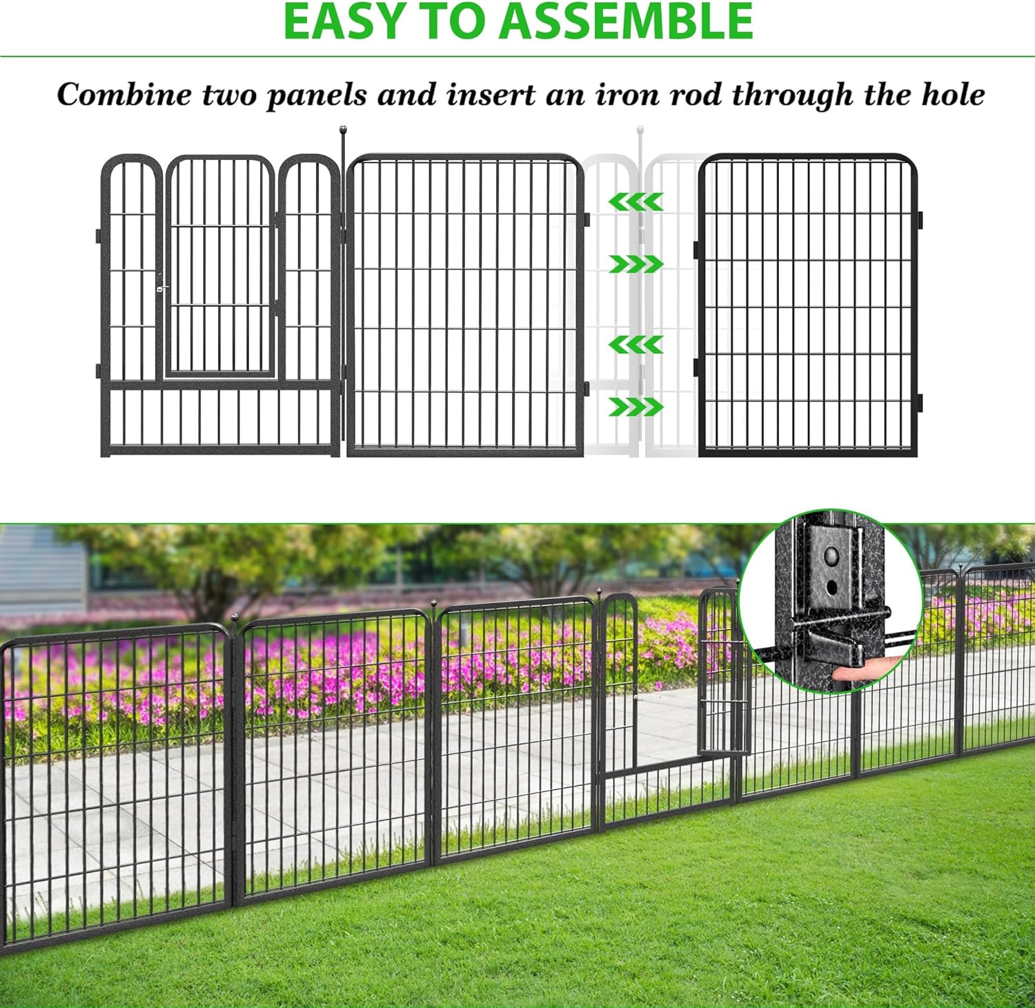 - Easy to Assemble: Our decorative fence panels outdoor is easy to assemble by combining two panels and inserting the rod through the hole. The metal fencing for yard can be fold down in minutes for easy storage and transportation. It can be expanded for longer size by adding more fences