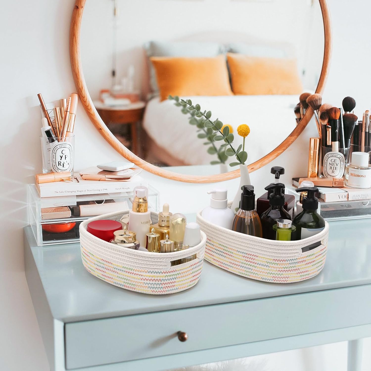 7 Piece Cotton Rope Woven Basket Set - Small Basket for Baby Nursery, Pets, Montessori, Dog & Cat Toy Boxes, Bathroom Organization Bins (White/Rainbow Stitching)