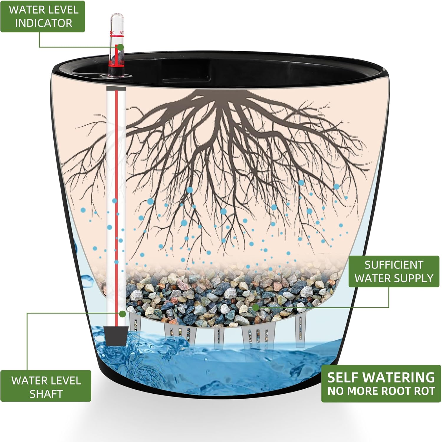 - Self Watering System: The integrated water reservoir keeps soil moist and aerated for optimal plant growth.