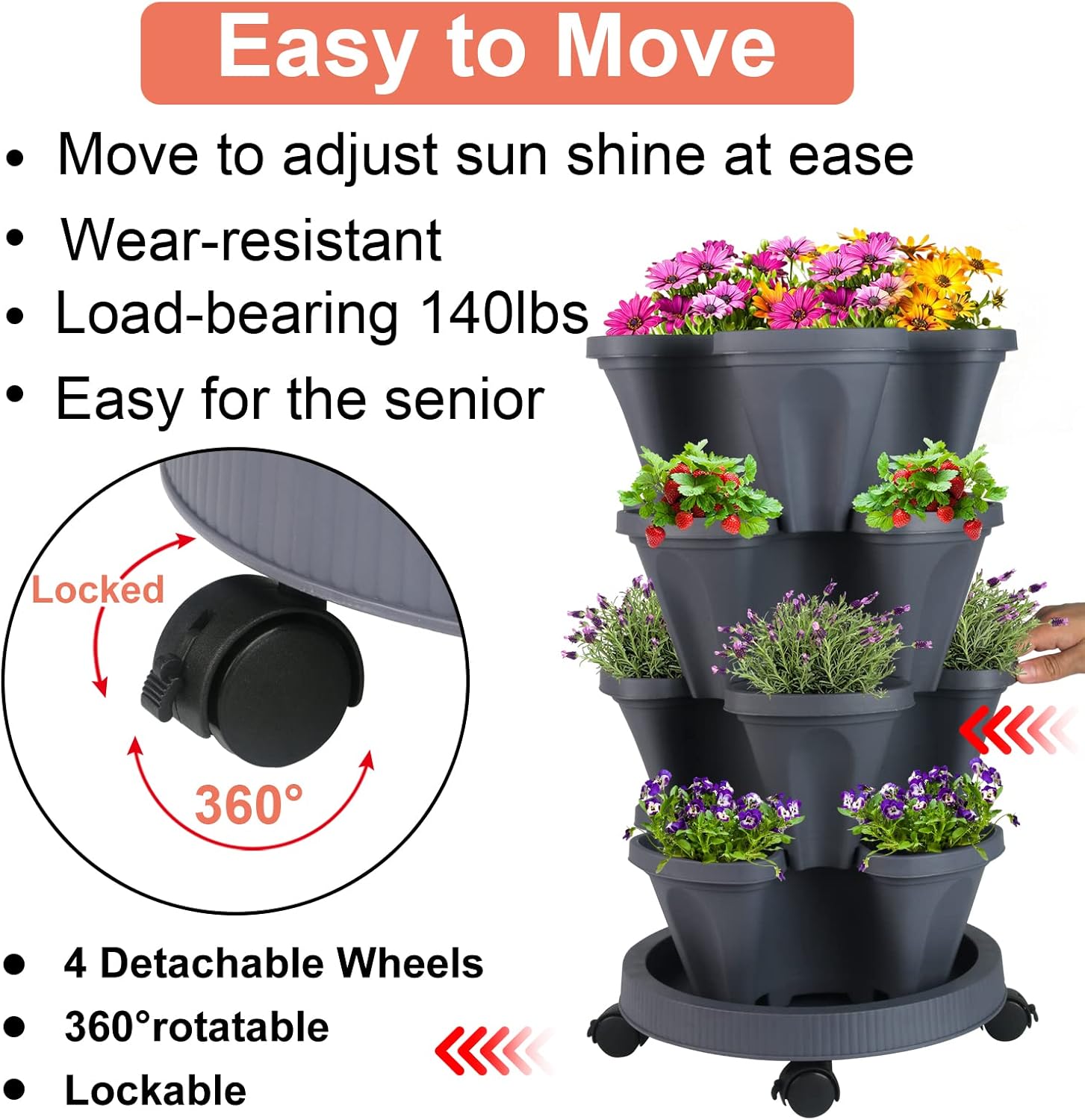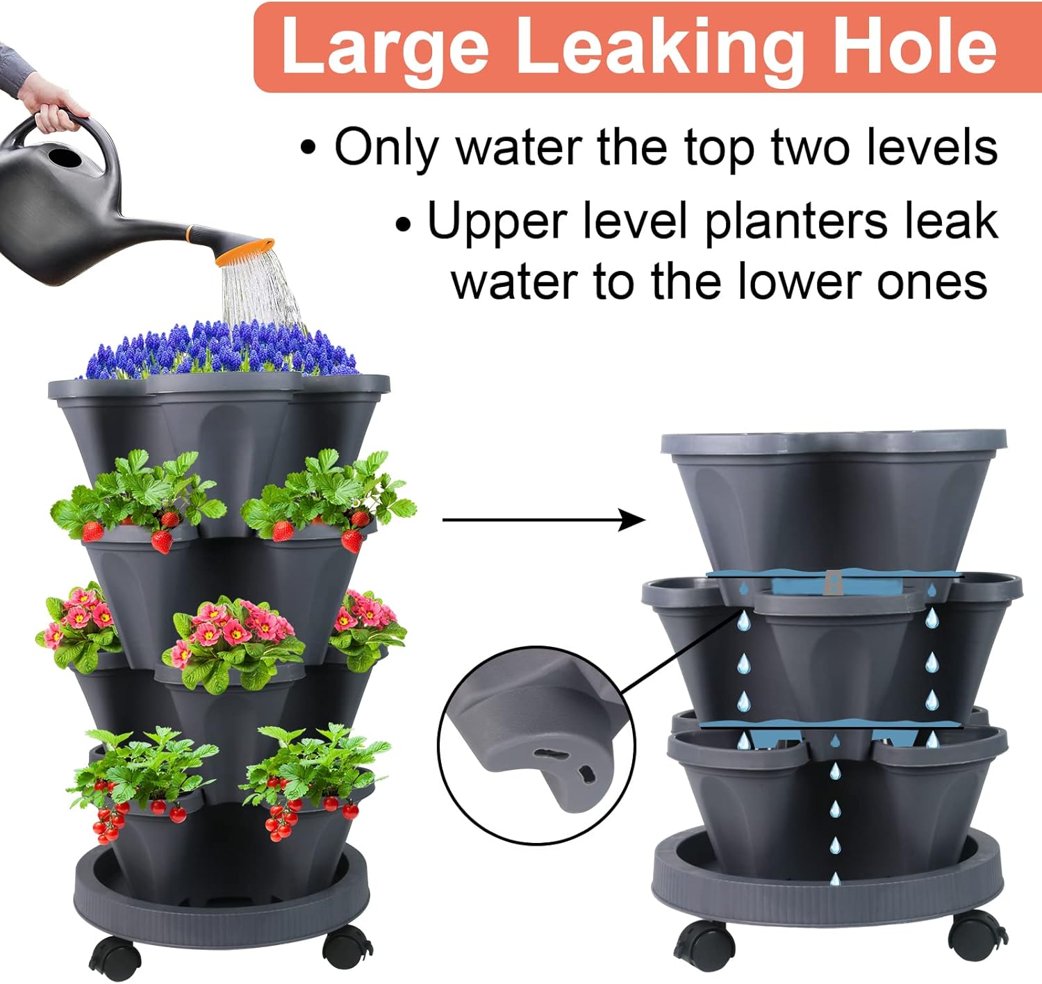DUNCHATY Stackable Planter, Vertical Garden Planter with Wheels and Tools, Self Watering Strawberry Planter Indoor/Outdoor 4 Tier Herb Planter Pots for Growing Vegetables and Succulents, Dark Gray