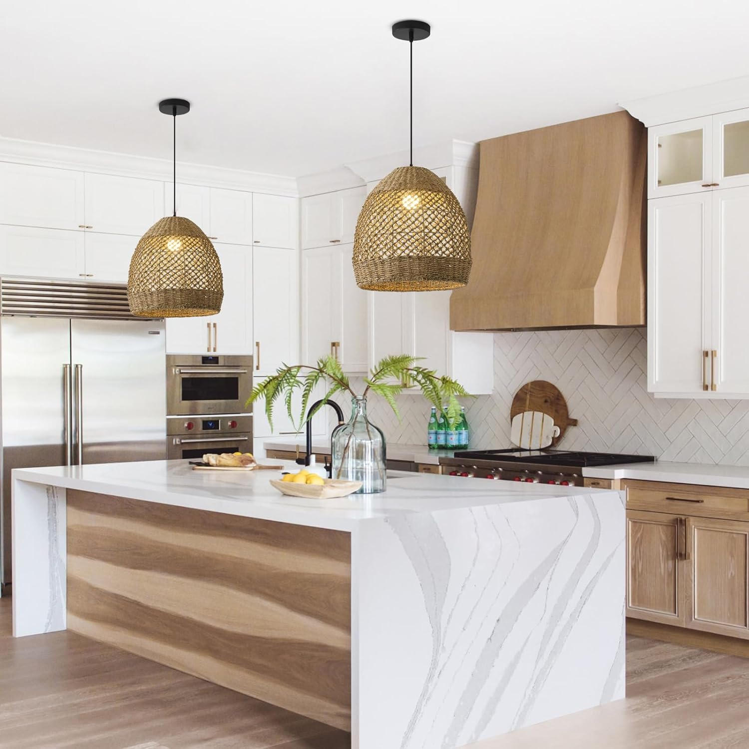 13.77" Rattan Pendant Light Rustic Hand-Woven Wicker Hanging Light 1-Light Water Plants Rattan Chandelier for Dining Living Bedroom Kitchen Farmhouse