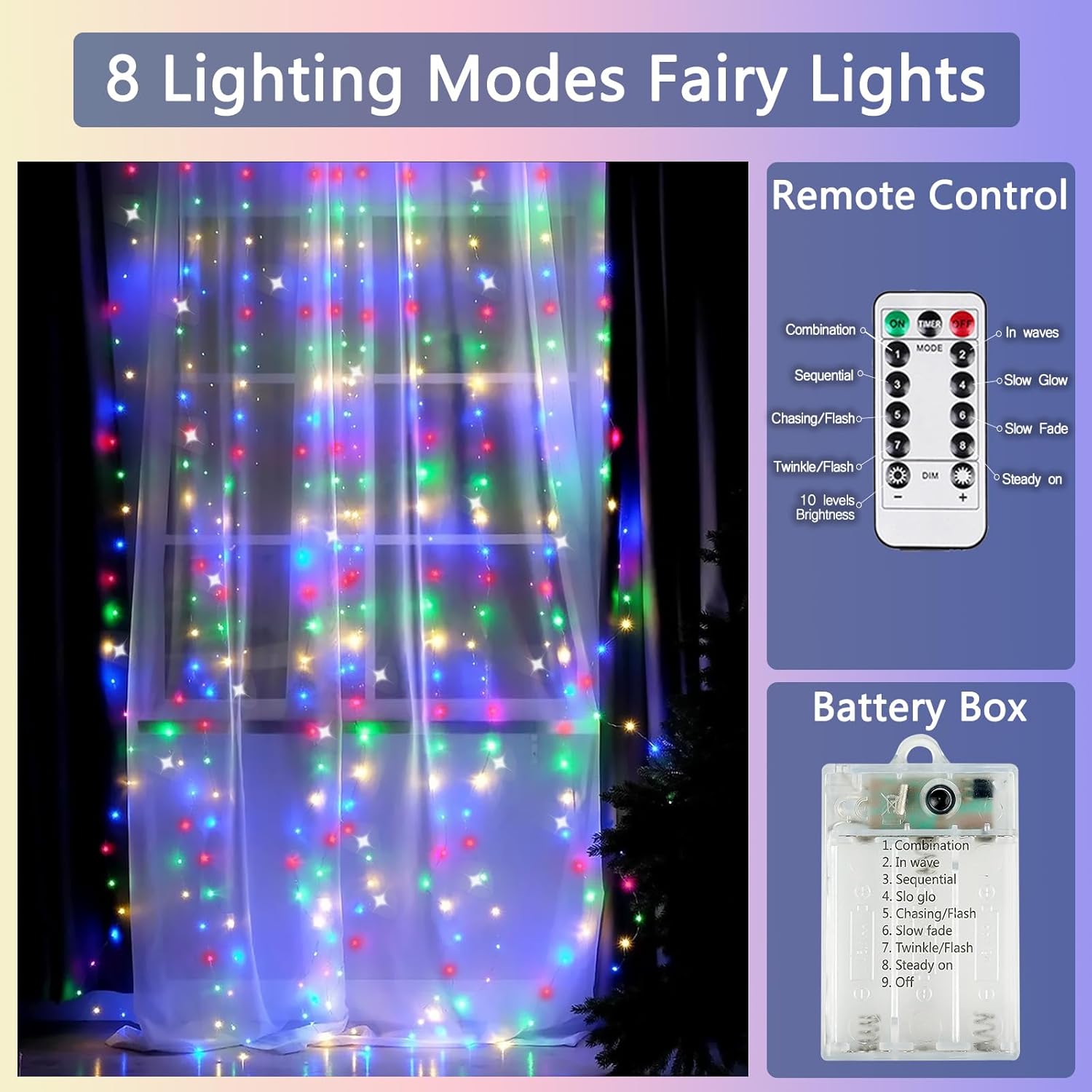- multicolor Lights Battery Operated: Made with ultra-bright LED and durable silver-coated copper wire and battery box, the fairy lights will be an ideal choice for your home decor. Each set contains 3pcs of string lights and 2pcs of remote controls. Each String light length is 26ft with 80 LED (AA battery case, batteries not included.)
