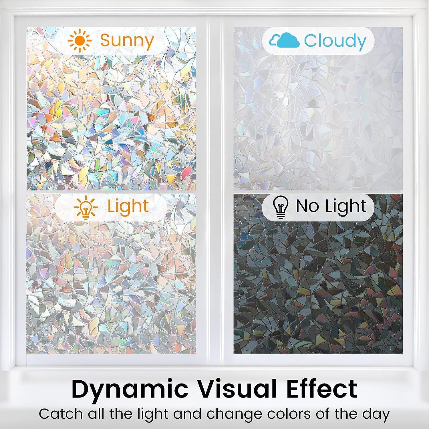 - Rainbow Effect: Crafted by 3D laser process, this rainbow prism window film will catch the light and create a rainbow effect when the sun hits the decal. The decorative window cling itself does not actually have any color, and the rainbow effect depends on the angle and intensity of the sunlight. Also, it classes up the room and makes the window look like stained glass without the expense of a custom stained glass window