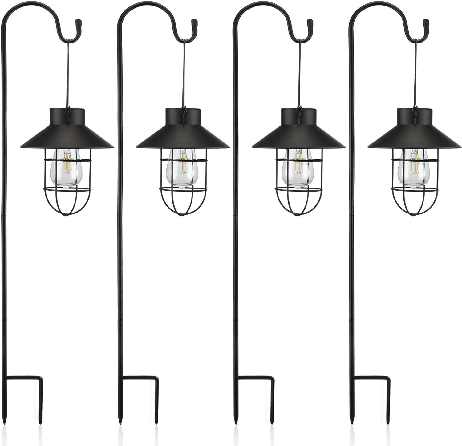 - Outdoor Decorative Solar Lantern Lights: you will receive 4 packs hanging decorative wall lanterns and 4 pieces 31 inches shepherd hooks, with 360 degree lighting angle; These beautifully crafted hanging solar lantern lights feature a retro look with painted iron shell and bright lights that will add a charming ambience for your garden