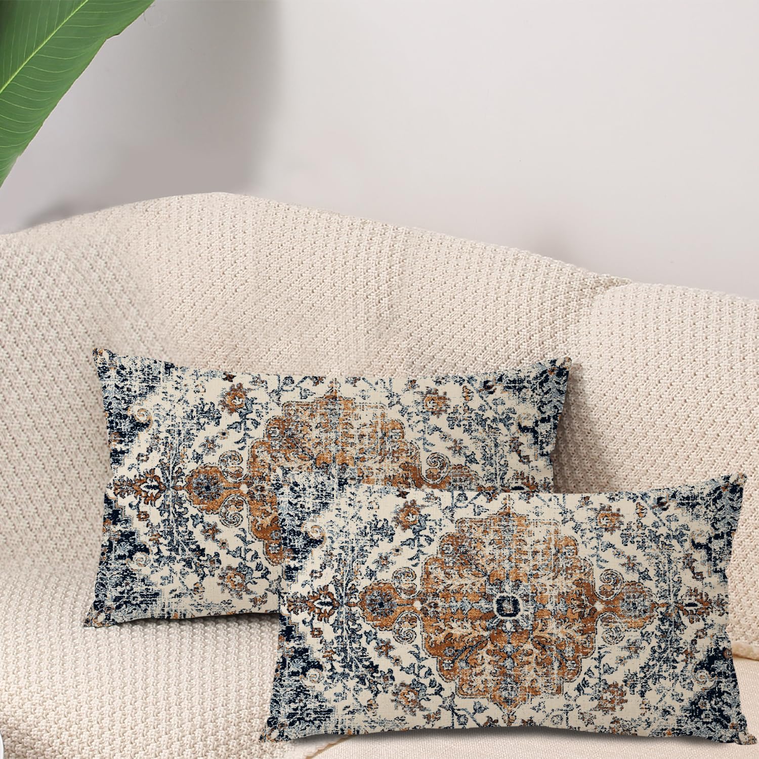 Outdoor Waterproof Pillow Set of 2, 12X20 Inch, Bohemian Vintage Carpet Pattern, Gold Blue Ethnic Design, Decorative Farmhouse Pillow Covers for Couch, Garden, Balcony