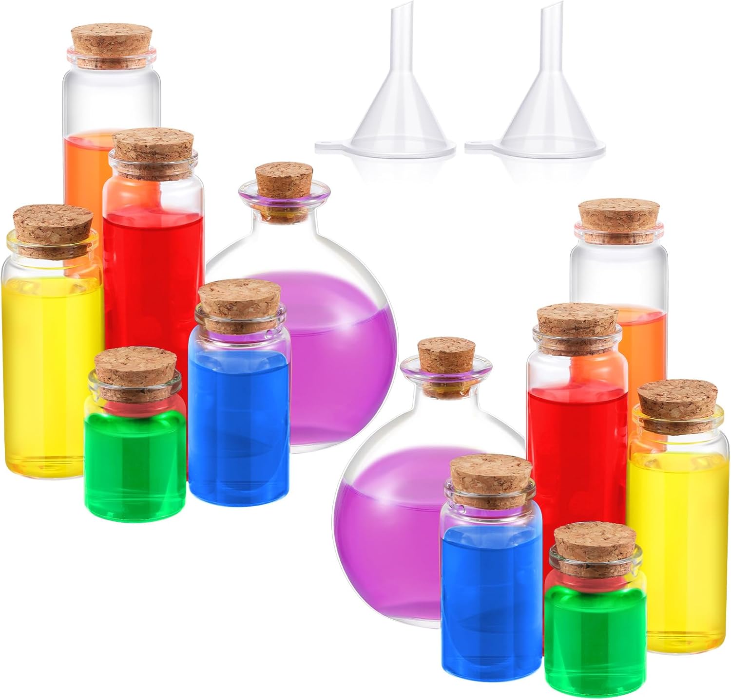 12 Pcs Halloween Glass Potion Bottle with Corks 6 Size Assorted Mini Glass Bottle Clear Message Jars with 2 Funnels for Halloween Decoration Party Favor Costume Prop DIY Crafts Witchcraft Supplies