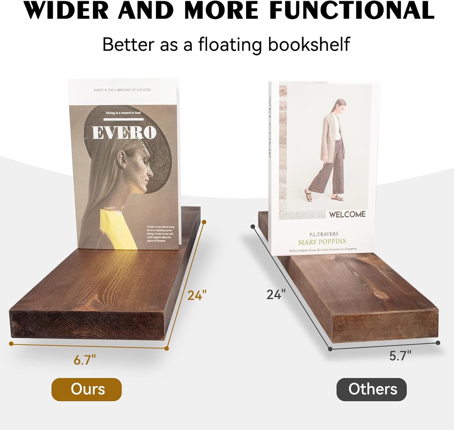 BGMG Wood Floating Shelves for Wall 24 inch Set of 2, Rustic Wooden Wall Mount Shelves for Bathroom Living Room Bedroom Kitchen Farmhouse -24x 6.7 x1.25 inch- Walnut Color