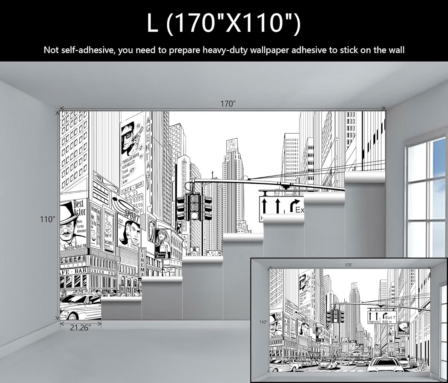 WFBHUA-Black and White New York City Wallpaper Hand Painted Times Square Wall Mural Decoration for Living Room Bedroom Offices(Not Peel and Stick)