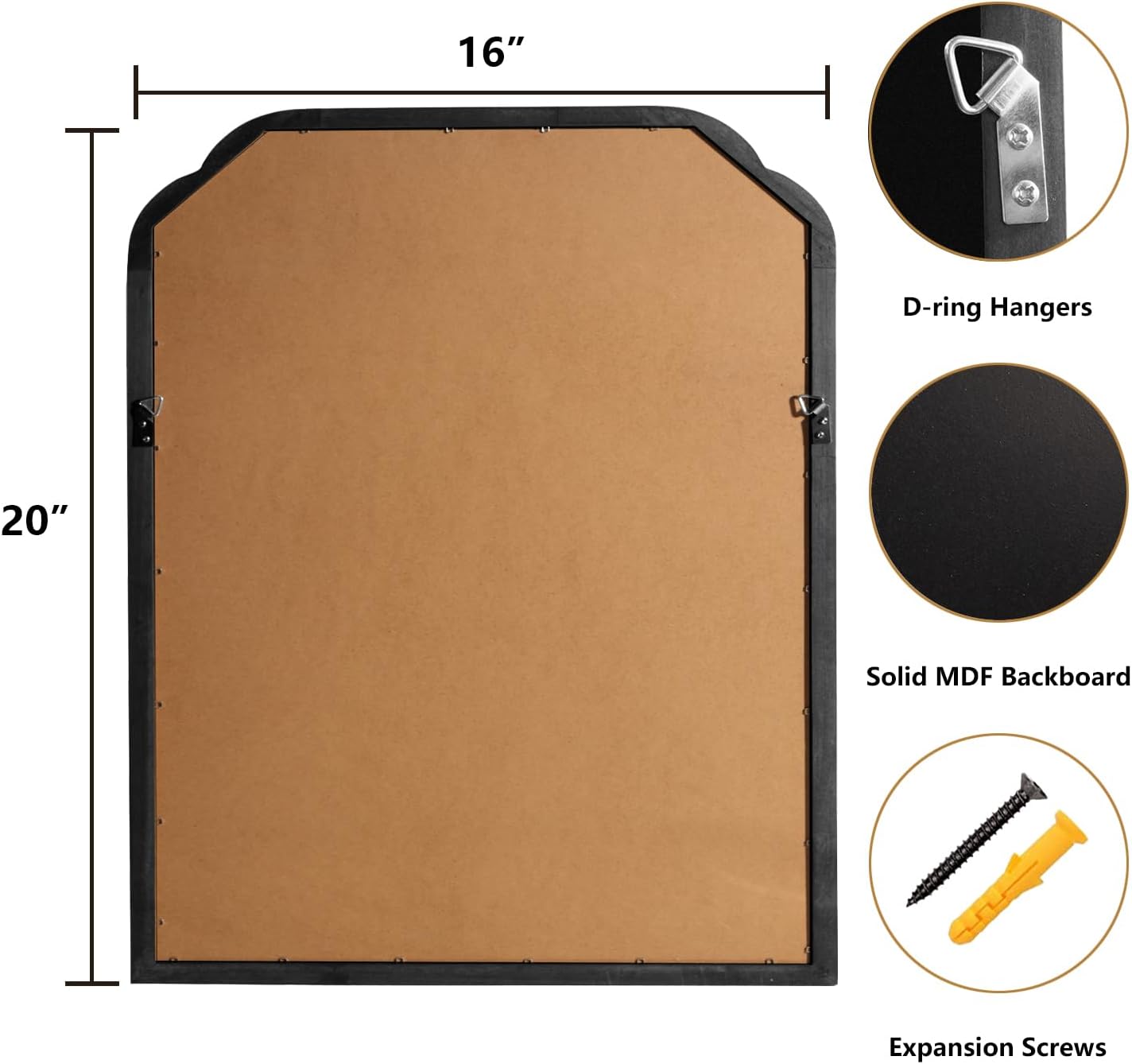 - Easy to install: back of the frame mirror has reinforced D-ring clips, measure the distance between the centers of the two back clasps, then use a ruler to draw the same distance on the wall, use a drill bit to make two holes where the hardware will be installed, install a screw in each hole until the screw head is about 0.2 inches from the wall, and finally secure the mirror.