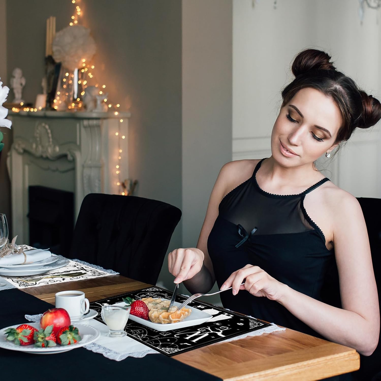 Umigy 6 Pcs Halloween Placemats 12"x18" Gothic Bat Placemats Kitchen Decoration Washable Witch Place Mats Rectangle Skull Table Mats for Halloween Dining Table Accessories(Black White Character Style)