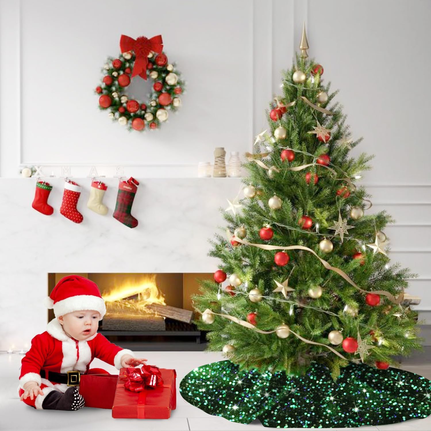 - âď¸ăSize Detail - Velvet Christmas Tree SkirtăYou will receive a 36 inches diameter green black glitter sequins tree skirt, fits under 8 foot tall trees. You can put some gifts, Christmas boxes, Christmas ball on the xmas tree cover mat. The sparkle velour Christmas tree skirts is perfect for decorating your home and become part of your holiday tradition.