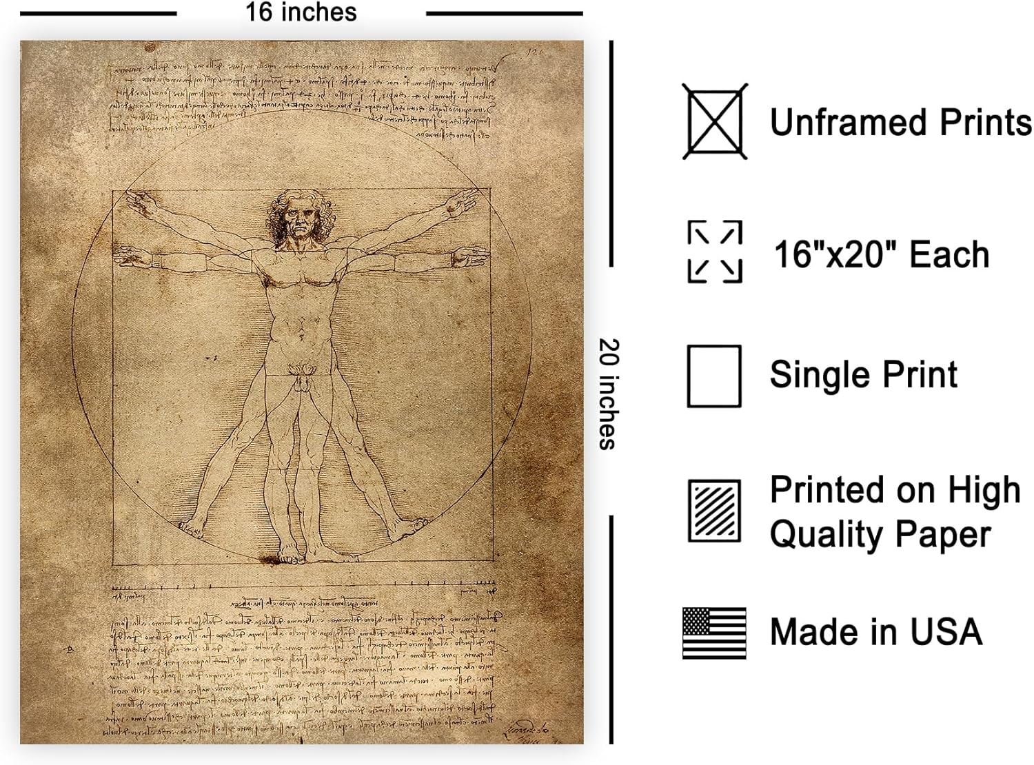 Poster Master Vintage Leonardo Da Vinci Poster - Retro Vitruvian Man Print - Drawing Art - Renaissance Art - Gift for Men & Women - Decor for Living Room, Bedroom or Office - 16x20 UNFRAMED Wall Art