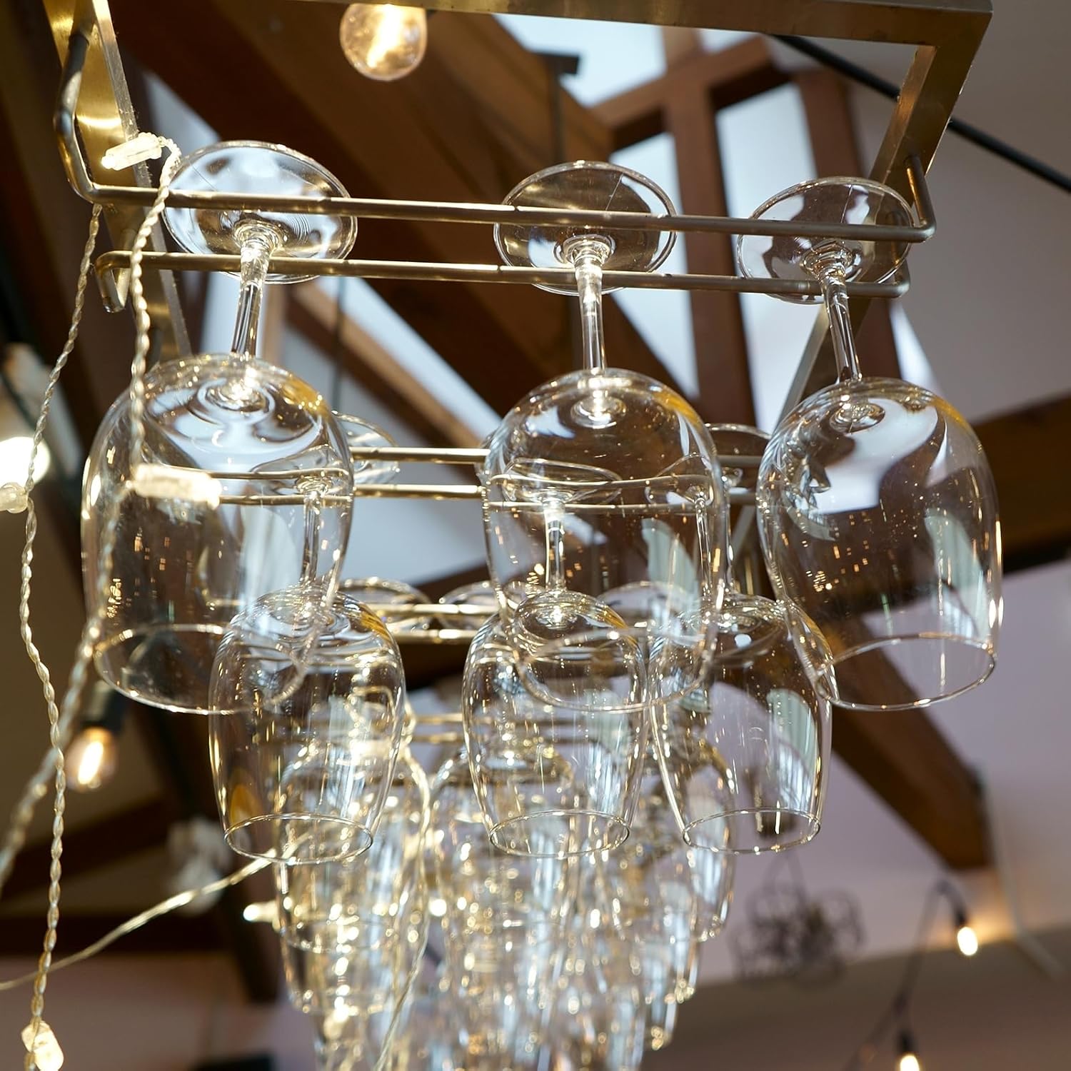 - [Compact/Elegant] This stemware rack can save cabinet space and fit the corner under the shelf perfectly, elegance to your kitchen or bar decor. The rack under the cabinet hanging glasses upside down keeps the stemware free of dust.