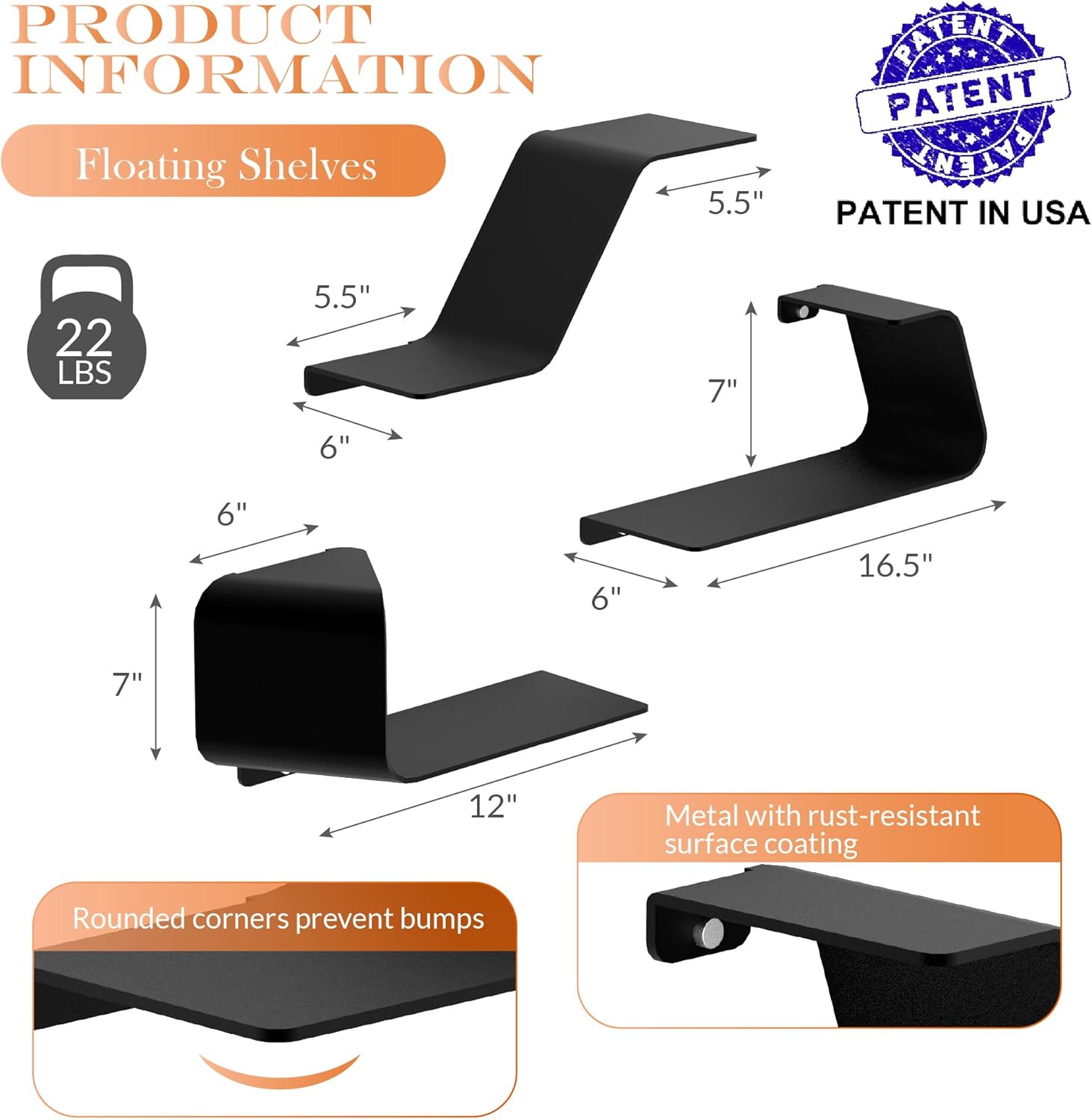 Floating Shelves, Wall Shelf, Set of 3 Wall Mounted Metal Shelves with Unique Design for Wall Storage, Book Shelf, Display Shelves for Bathroom Bedroom Kitchen Living Room for Home Black