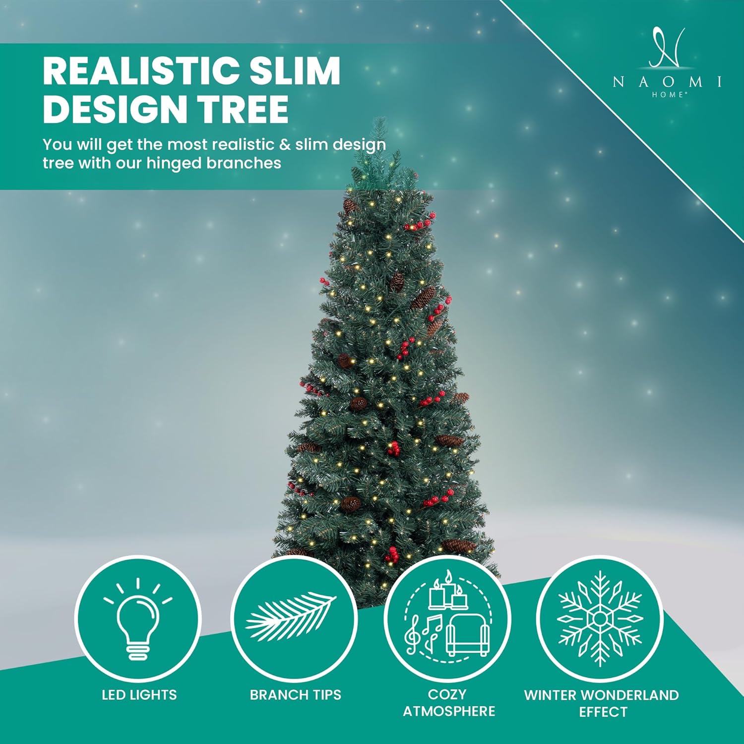 - COMES PRE-DECORATED TO SAVE TIME : The fake Christmas Tree comes Pre-lit with 350 incandescent lights, 36 Realistic Pine Cones and 35 Red Berries that make setting up your tree a breeze. These lights emit a warm glow that highlights your decorations and holiday gifts making your Slim Christmas Tree extra-special. Naomi Home Christmas Trees with Lights always stand for trust and quality.