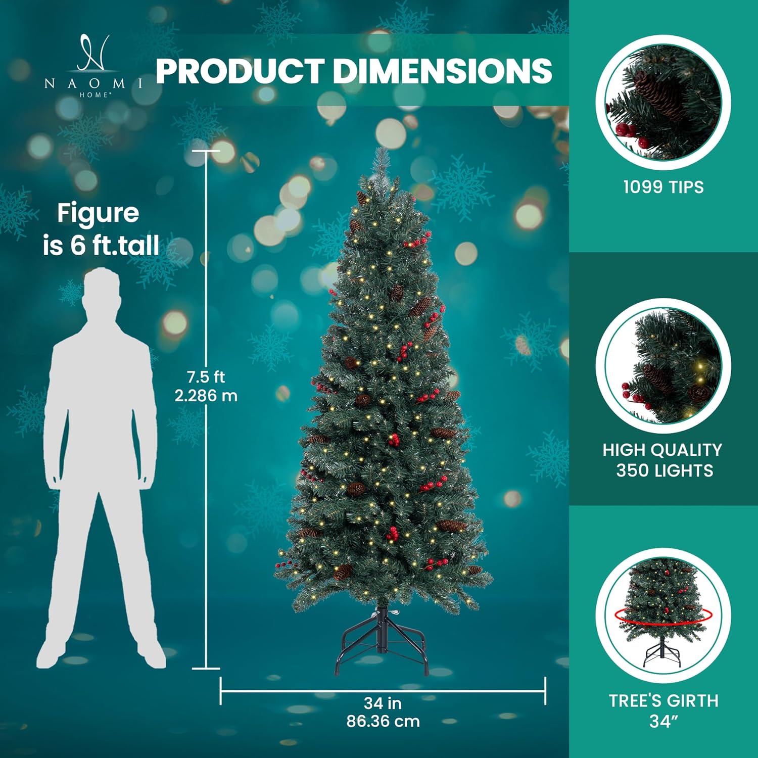 Naomi Home Belen 7.5ft Pencil Christmas Tree Prelit pre-Decorated with Pine Cones, Red Berries, 1099 Branch Tips, 350 Warm Lights and Metal Stand, 34" Wide Skinny Christmas Tree with Lights