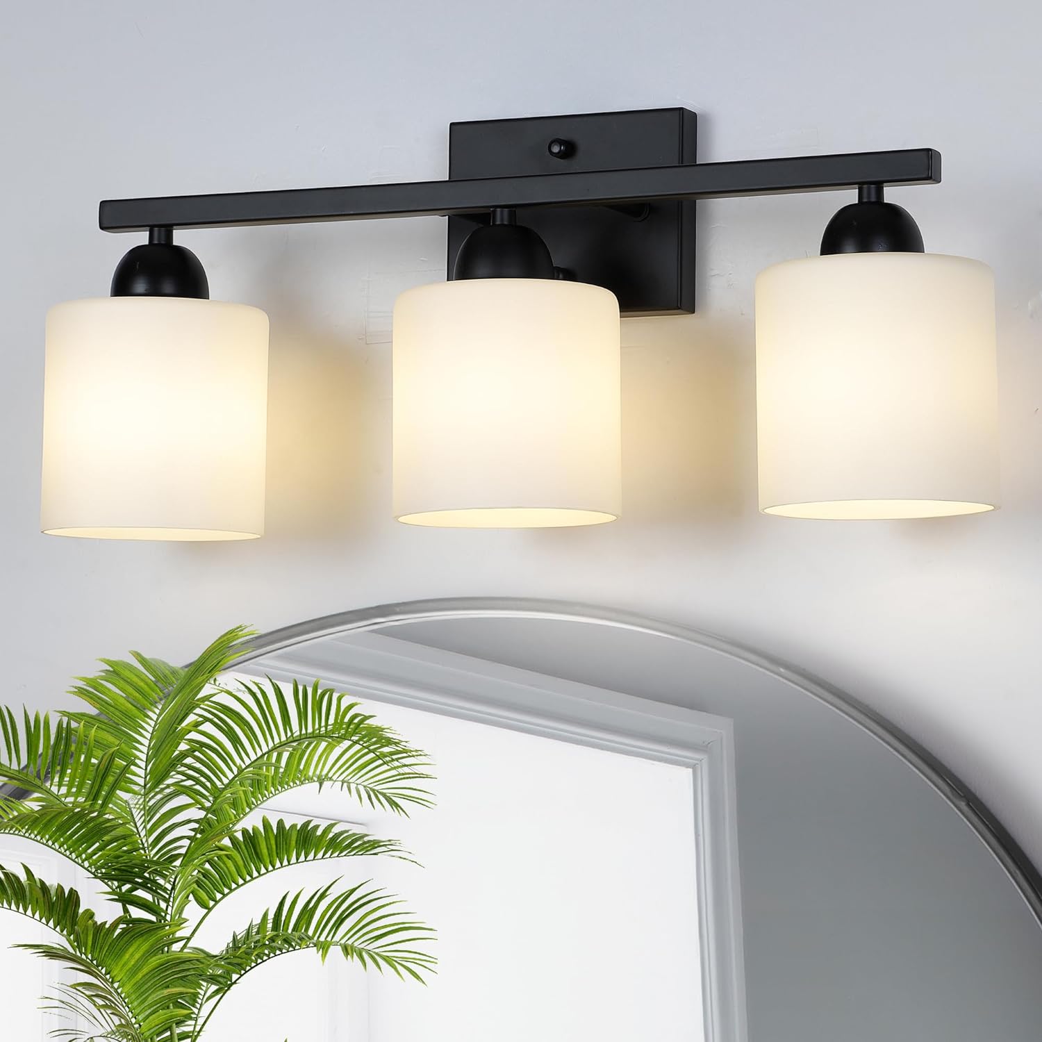 Milk Glass Vanity Lights for Bathroom, 3 Light Matte Black Bathroom Light Fixtures Over Mirror, Ceramic E26 Sockets Wall Mounted