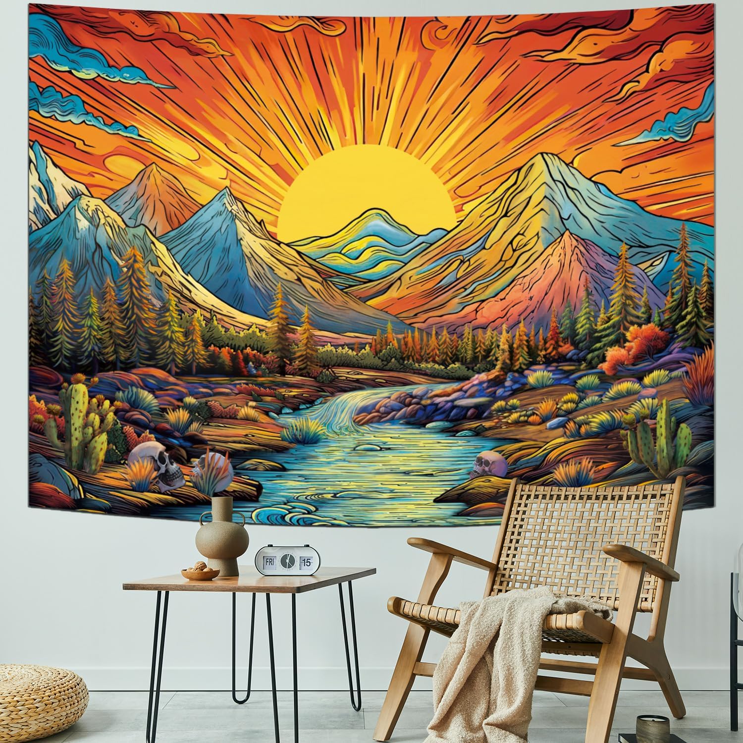 Serborlur Boho Sun Mountain Tapestry Trippy Forest Tree Tapestries Vintage Aesthetic Plant Magical River Wall Tapestry Nature Landscape Wall Hanging for Bedroom Living Room (59.1 × 78.7 inches)