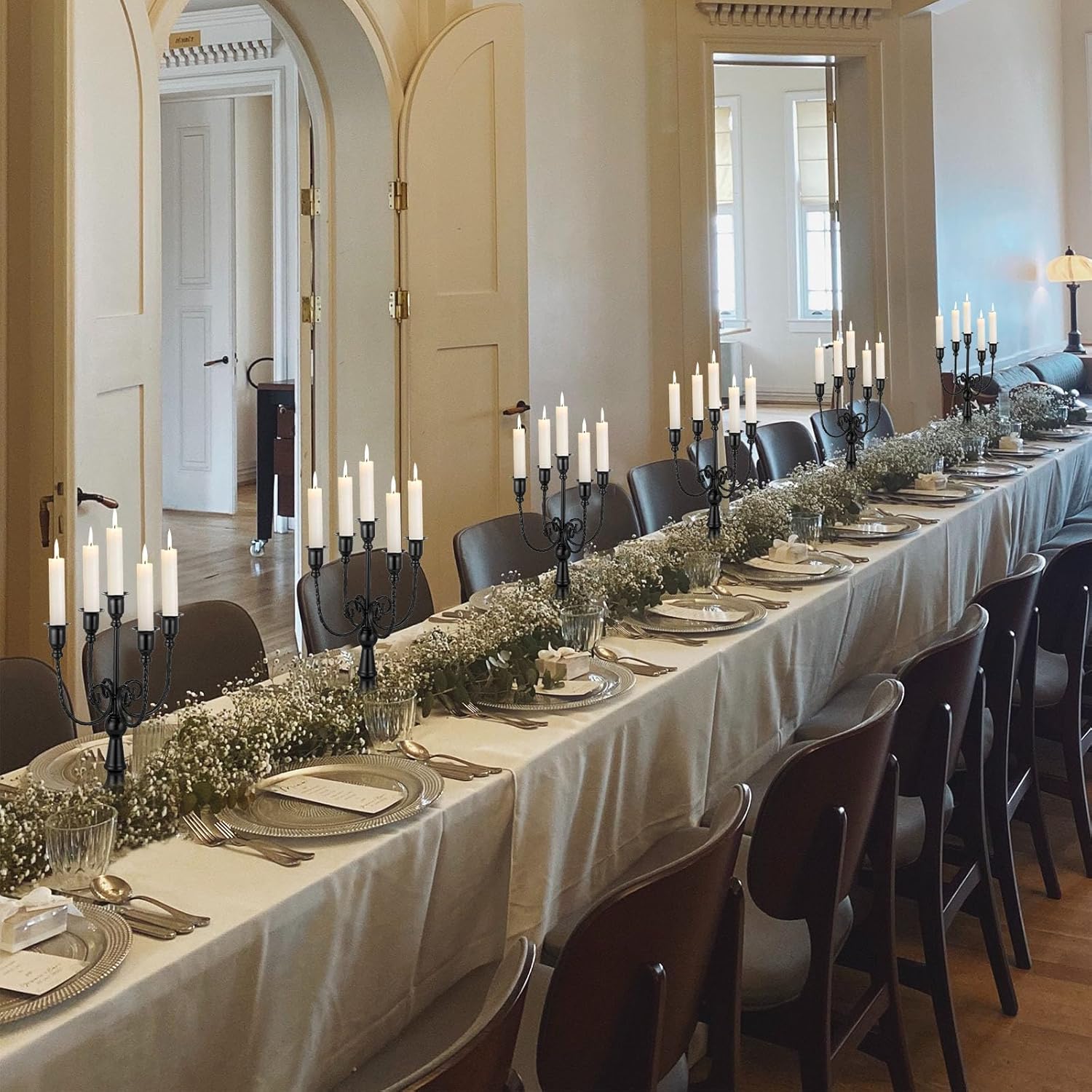 - QUALITY CRAFTSMANSHIP AND STYLISH DESIGN: Crafted of metal, these candelabras for centrepieces add a touch of old time beauty and modern appeal with curled vine style candle holder rod, elegant pattern branch and stable pedestal. The candlestick set will add an eye-catching look to any space thanks to its smooth and matt surface finish.