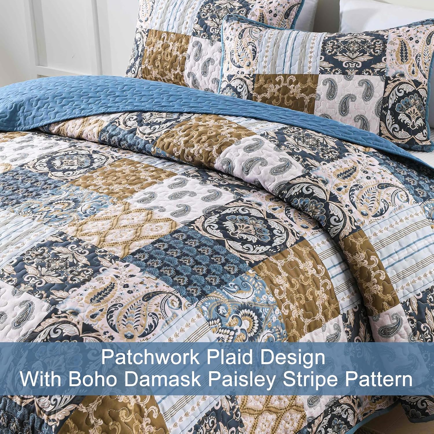 - PATCHWORK BOHO QUILT SET: The boho bedspread king size bedding set featuring a patchwork plaid design. Combined with bohemian stripe damask and paisley pattern gives this bedspread coverlet a elegant atmosphere.