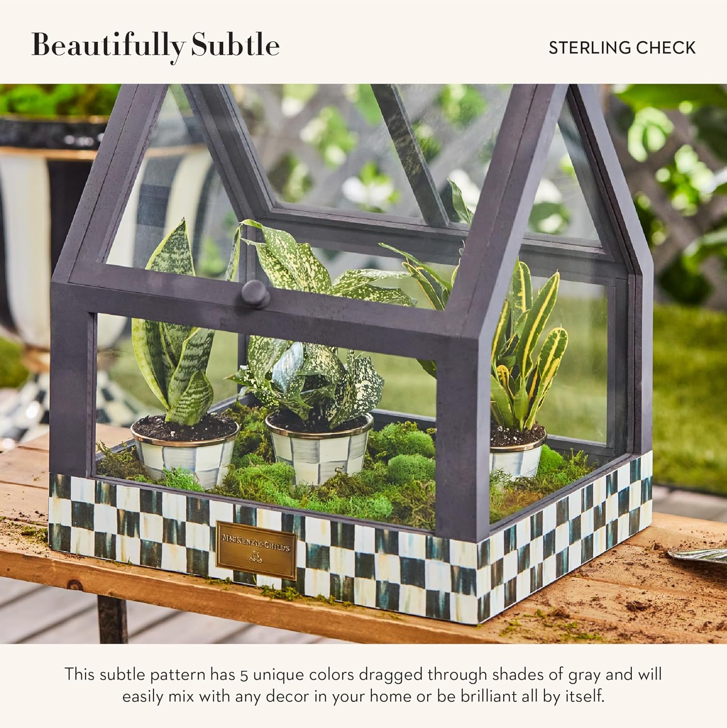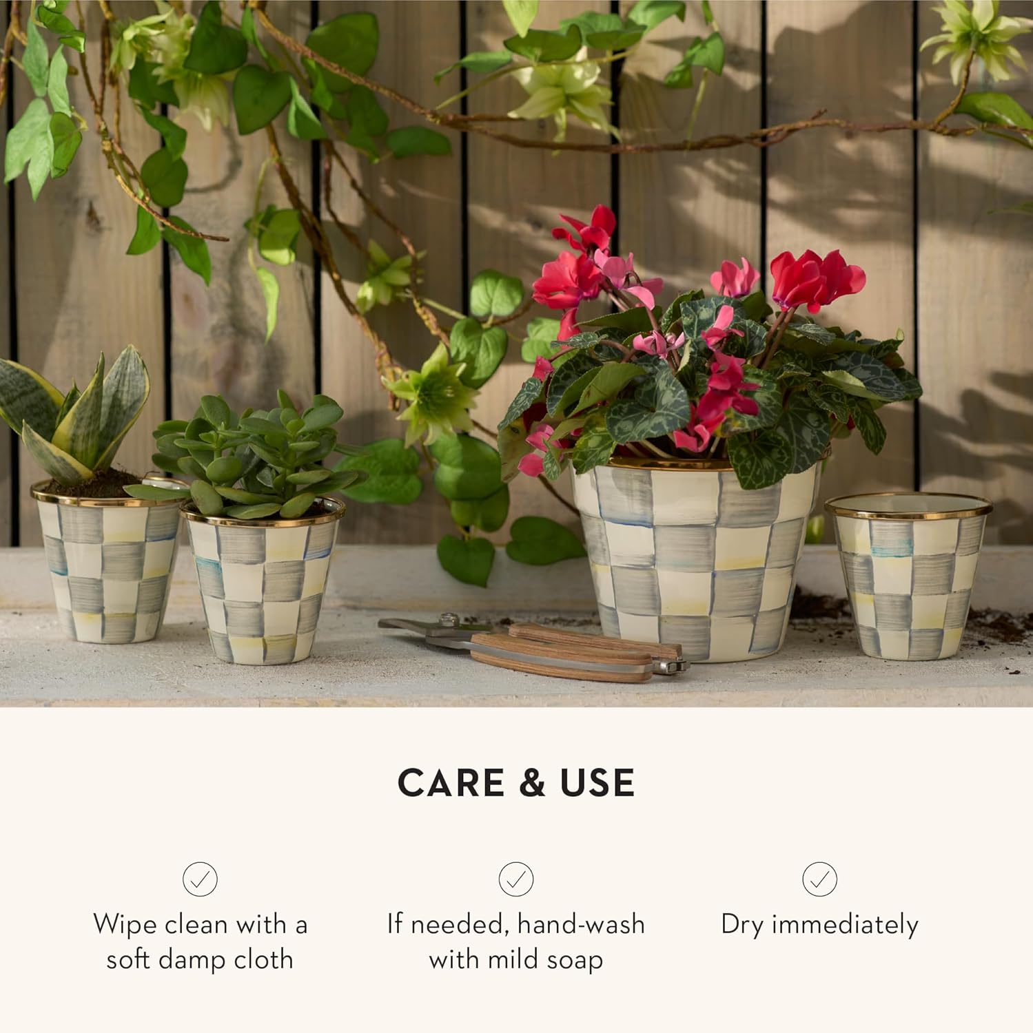 - INDOOR & OUTDOOR PLANTER POTS: This trio of petite Sterling Check Enamel Herb Pots is hand painted with subtle gray-and-white color-dragged checks. Presented in a woven sinamay pouch tied with a black grosgrain bow, this little kitchen herb-garden set even makes for a fun party favor!