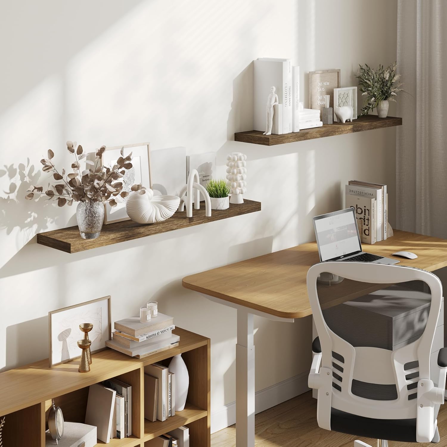 - GREAT FOR ANY ROOM: Our wood floating shelves are made of MDF with a frosted surface texture for a mordern feel that blends perfectly into a variety of different scenes; Having this small floating shelf not only for its decoration effect, but also for its high practicality; It can be used for organizing all household rooms, such as bedroom, living room, study, toilet, cloakroom, even kitchen and warehouse