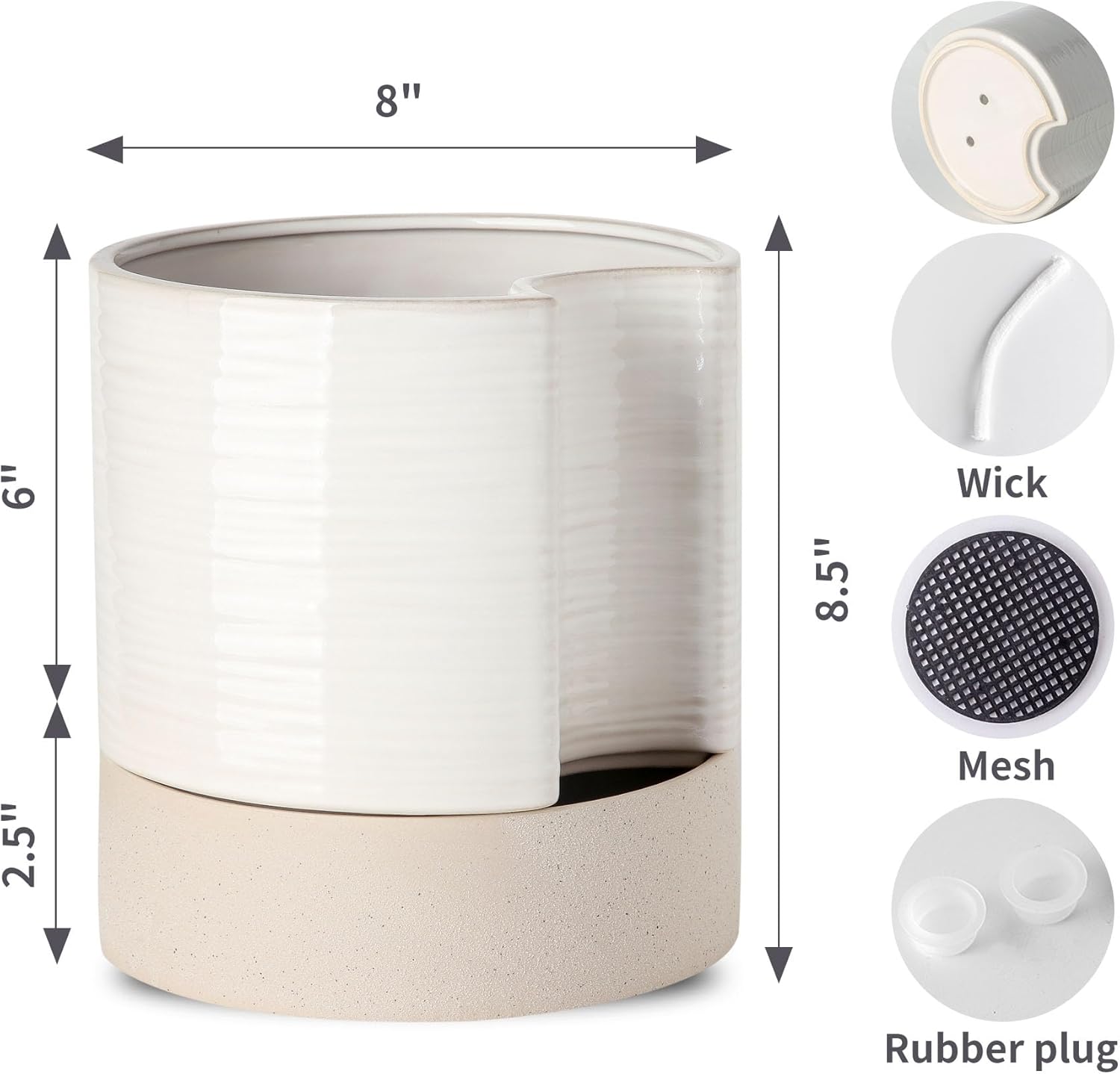 - EASY SELF WATERING - Considering the large size of the 8 inch planter,the plant pot is heavy and sturdy for most of the plants. In order for easy watering ,this 8 inch self watering pot comes with the grooves on the side for easy refilling the water.