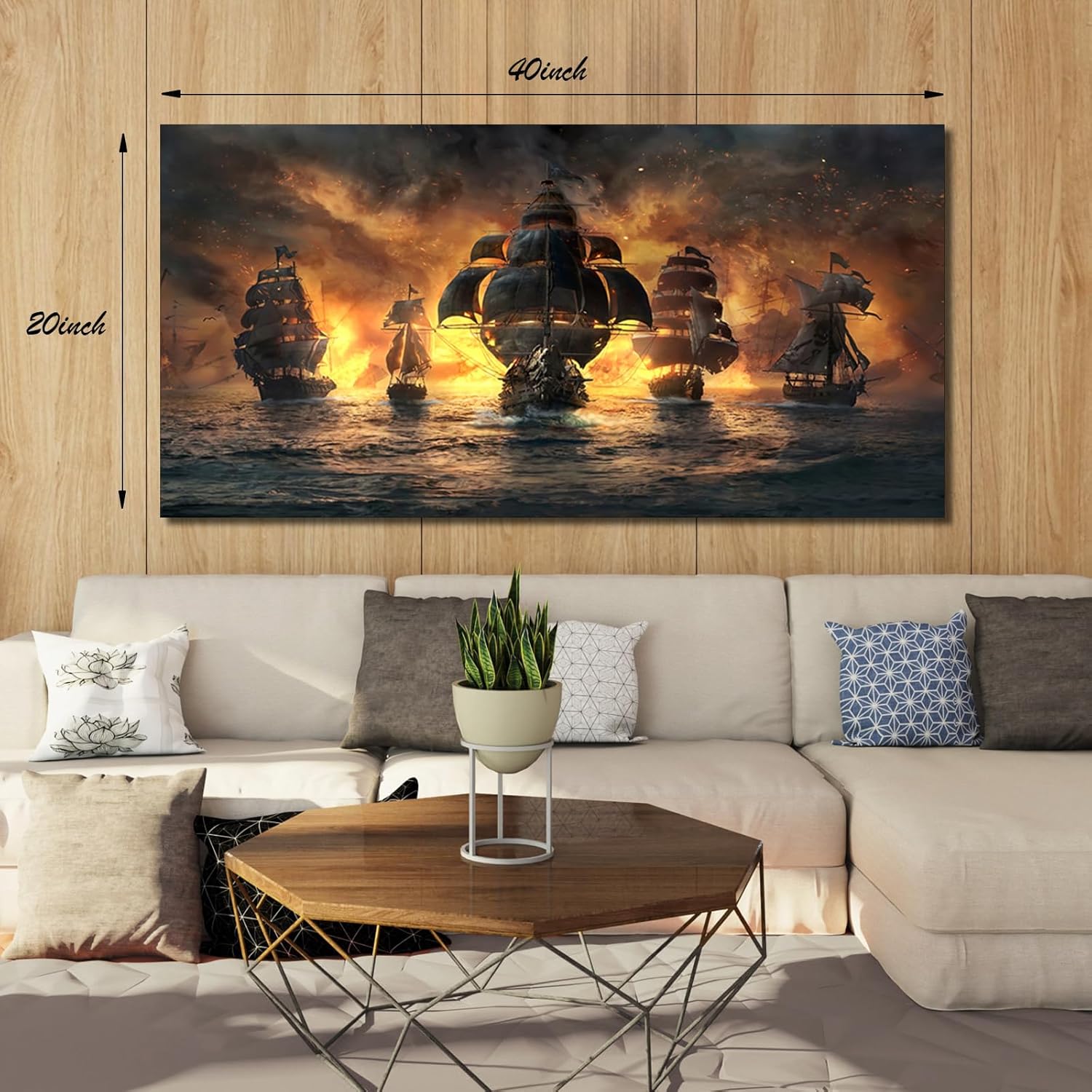 - 18TH CENTURY PIRATE SHIP WALL ART DECOR: wall decor living room size 40X20". This vintage nautical themed wall art features sailing ship with dark cloudy & flames that evoke the spirit of adventure and exploration.