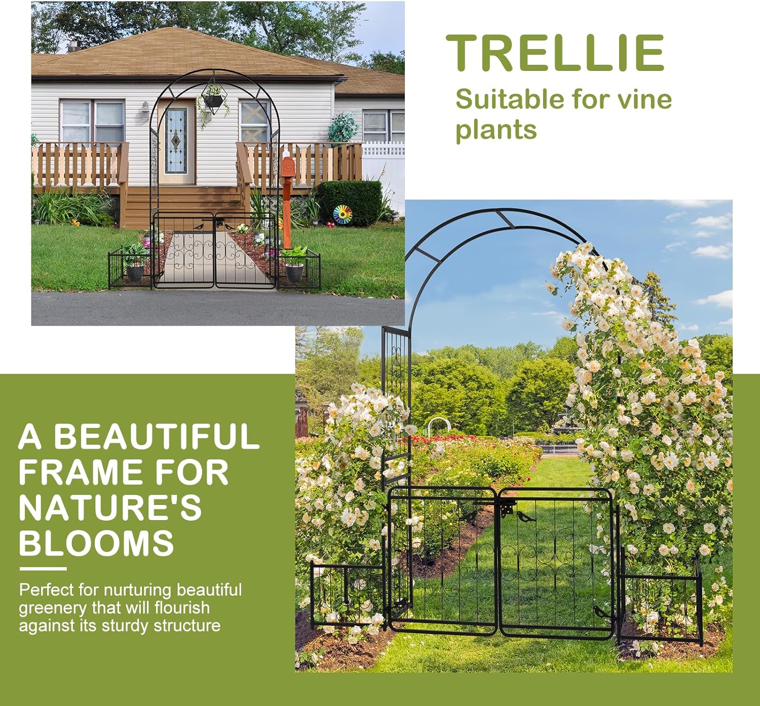 - 【DELICATE APPERANCE】Exquisite workmanship ensures that every corner and surface of the arch is smooth and burr-free. The graceful garden arch create a beautiful entrance to your garden with its delicate lines and vintage apperances. Uniquely styled door with deadbolt serves as entrance to your patio, adding a striking focal point to your yard