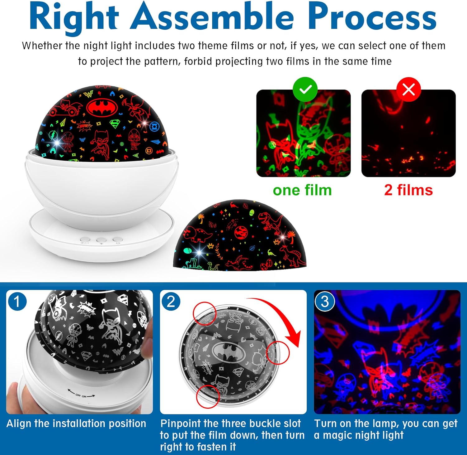 - Precautions Before Use: The dino film is the default cover, batman film is covered under the dino film, so the first one can be seen when open the product is the dino film. If the dino film is not removed, batman film will not be displayed and projection may fail