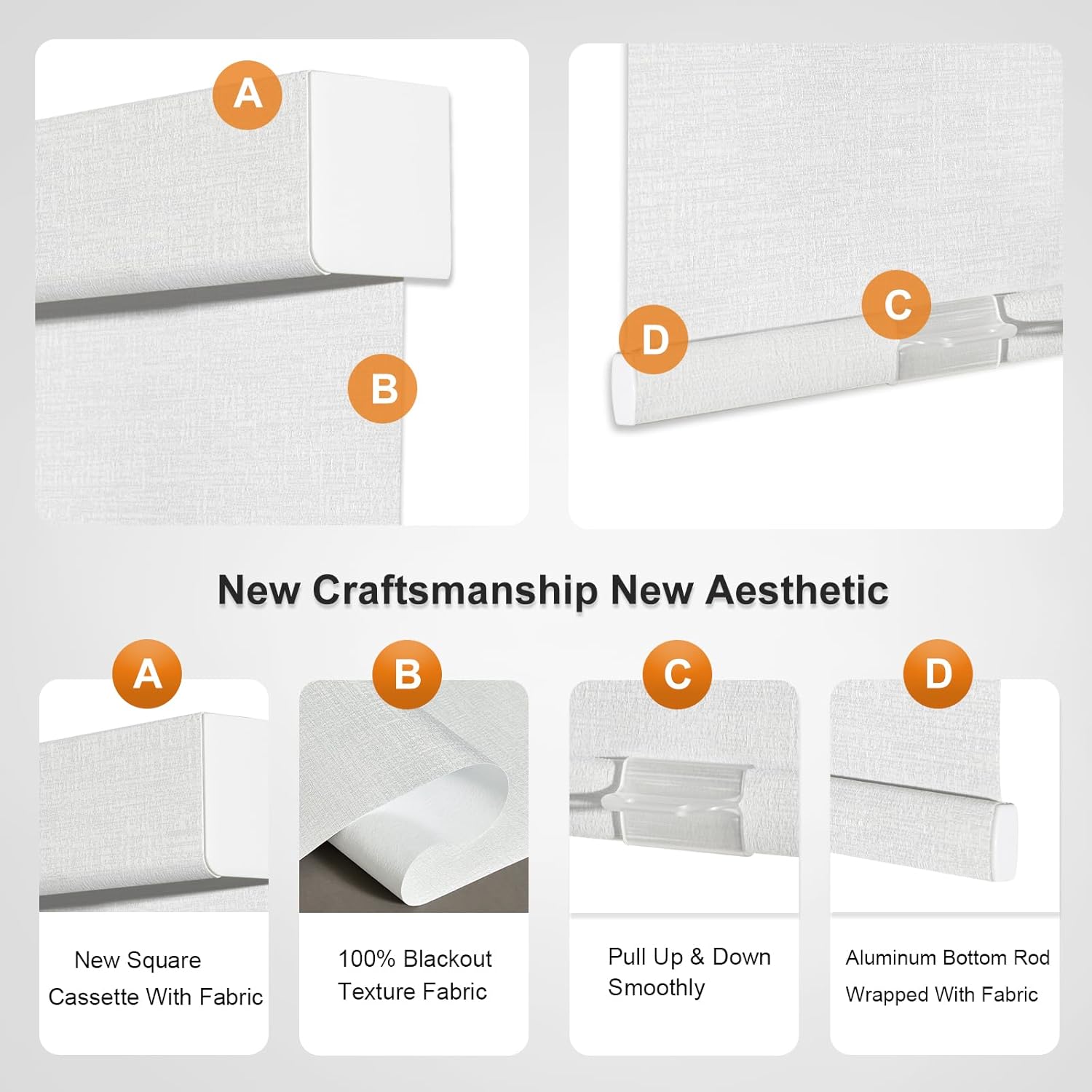 - [COLOR UNITY]: Our Roller blinds use the new valance, it is wrapped in fabric of the same color as the shade as well as the lower rod, the shades uniform in color and makes the room more harmonious and beautiful. This cordless shades made of blackout jacquard fabric which can filter light, protect UV rays and heat insulation.In addition, instead of plastic brackets, our upgraded metal brackets are more durable and make the fabric closer to the window so as to ensure a better shading.