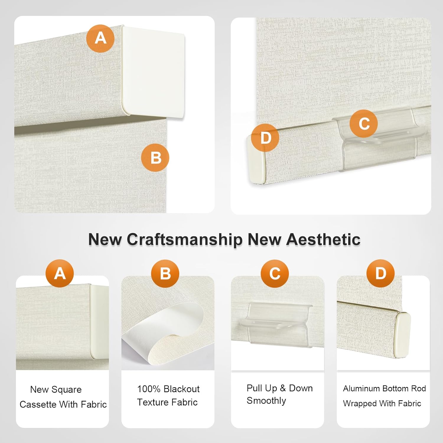 - [COLOR UNITY]: Our Roller blinds use the new valance, it is wrapped in fabric of the same color as the shade as well as the lower rod, the shades uniform in color and makes the room more harmonious and beautiful. This cordless shades made of blackout jacquard fabric which can filter light, protect UV rays and heat insulation.In addition, instead of plastic brackets, our upgraded metal brackets are more durable and make the fabric closer to the window so as to ensure a better shading.