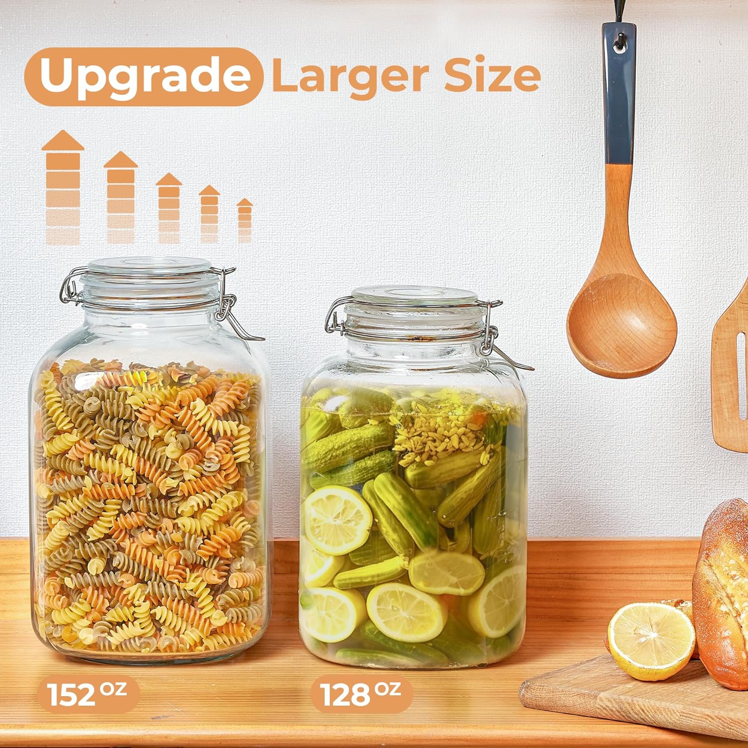 ComSaf Rice Container 152oz, Flour Sugar Storage Containers, Glass Jars with Airtight Lid, 1.17 Gallon Mason Jar, Large Storage Containers with Lids for Pickled Egg, Pasta, Cereal, Beans, Set of 2